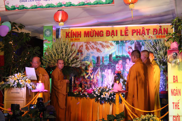 Thượng tọa Thích Như Tại tuyên đọc Thông điệp Phật đản PL.2558 của Đức Pháp chủ GHPGVN. ĐĐ.Thích Thiện Minh đọc diễn văn khai mạc Đại Lễ Phật đản PL.2558 của Hòa thượng Chủ tịch Hội đồng Trị sự GHPGVN. Sau khóa lễ tụng kinh Khánh đản, lễ tắm Phật diễn ra trong không khí thành kính, trang nghiêm, hoan hỷ và thanh tịnh.