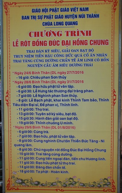 Dịp này, chùa Long Quang cũng phát nguyện tổ chức lễ trai đàn cầu siêu bạt độ, trai tăng cúng dường và chẩn tế âm linh cô hồn trong hai ngày để nguyện cầu thế giới hòa bình kẻ còn người mất đều được ân triêm phước lợi.