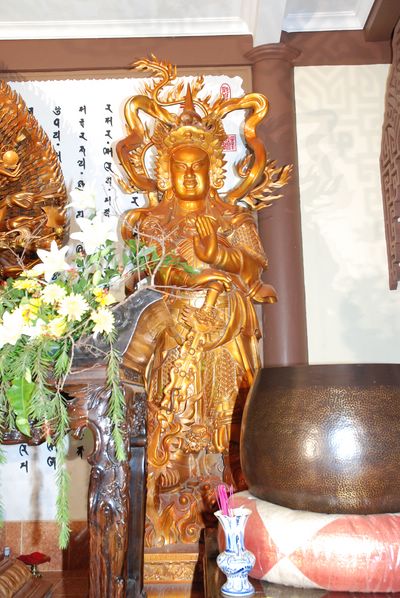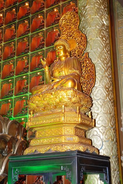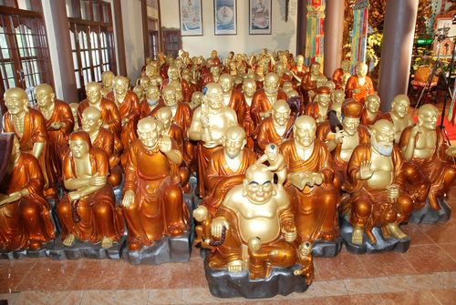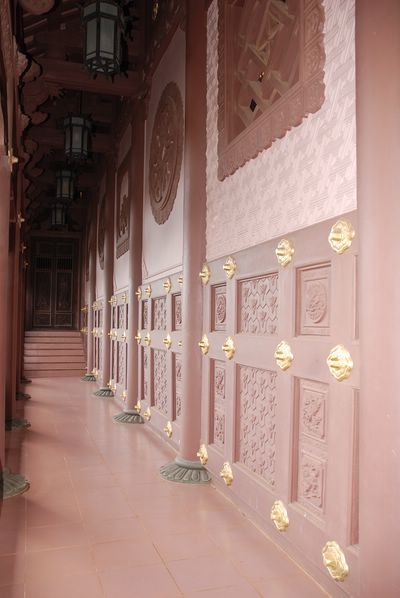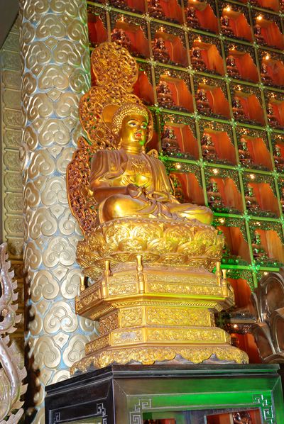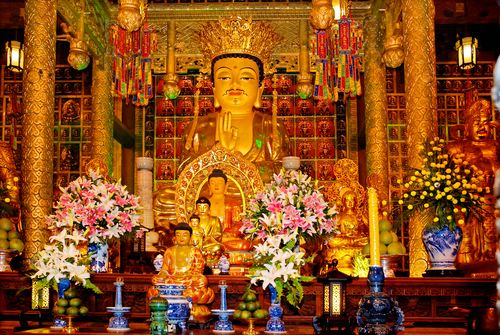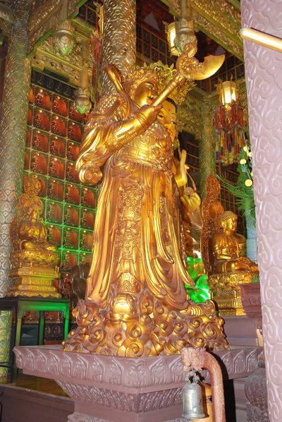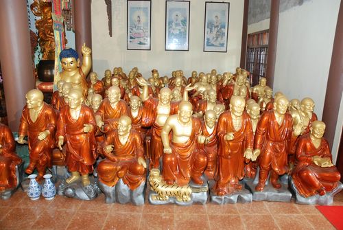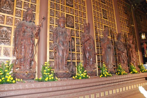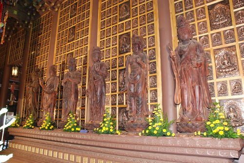 Hai bên tả hữu, tôn trí tượng Thập nhị Duyên Giác (12 vị đại bồ tát), mỗi tượng cao ba mét làm bằng gỗ mít, sơn son thiếp vàng, Hai bên vách chánh điện có 30 ngàn vị Phật