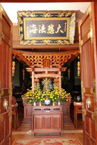Cửa chánh điện chiều cao 6m, khung cửa dày 4 tấc với 6 cánh cửa dày 2 tấc, tất cả cửa được chạm khắc 6 vị đại Bồ Tát.  Chánh điện chùa cao 16m, trần nhà làm bằng gỗ pơ-mu, và sập gụ. Bộ lư và đèn được làm bằng chất liệu gốm, phục chế theo phong cách đời Lê mạt. Bàn thờ Phật tại chánh điện lớn nhất , với chiều dài 6m và cao 1,2m. Bộ chuông mõ lớn nhất. Kế đến là cặp bảo cái, cặp tràng phan, bệ hoa sen được đưa từ Nhật về. Các tượng Phật và Bồ tát thì được đưa từ Đài Loan về.