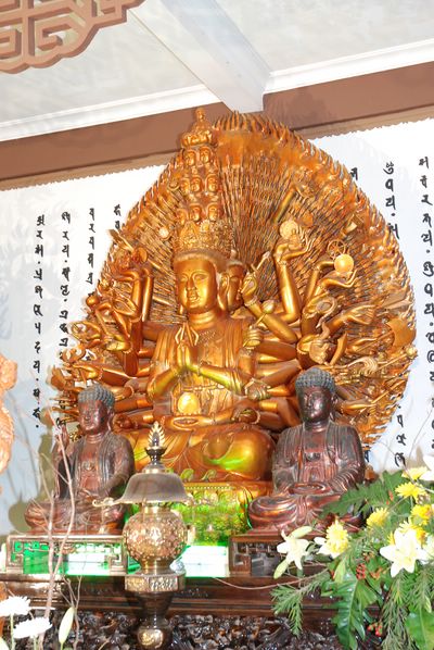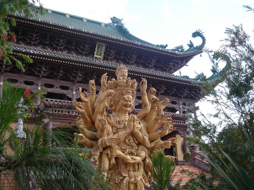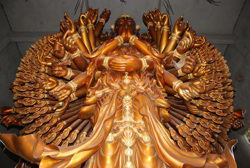 Tất cả các bức tượng này được chạm nổi vào tường rất công phu. Thẳng theo hướng tây tầng dưới của chánh điện là; Đại Bi đường thờ Quan Thế Âm Bồ Tát Thiên Thủ Thiên Nhãn, mà theo cách gọi dân dã đó là Phật nghìn mắt nghìn tay, theo phong cách Việt Nam, cao 7,5m, thờ hai bên tượng Thiên Thủ Thiên Nhãn là 2 tượng Hộ Pháp cao 3m, ba pho tượng được chạm khắc bằng gỗ.