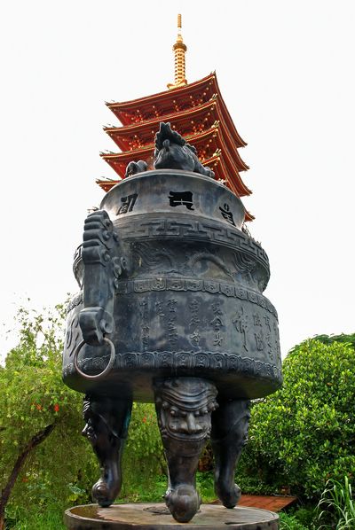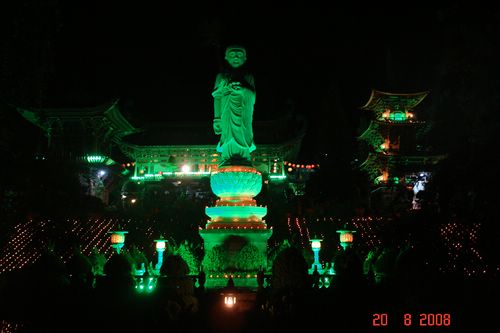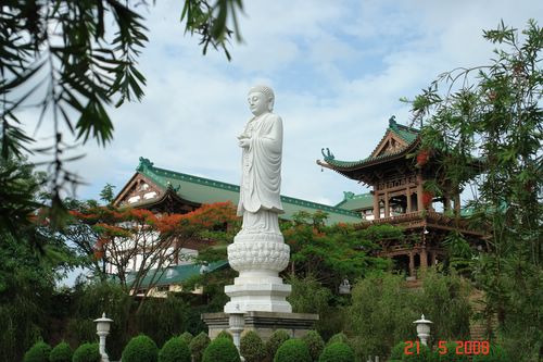 Bên trái chánh điện là tháp Từ Ân thờ tổ khai sơn, tháp có ba tầng mái, lợp ngói vảy rồng, trang trí rồng và hoa sen cách điệu. Bên trái chánh điện là tháp chuông, tôn trí đại hồng chung nặng 4 tấn. Trước sân chùa Tượng đức Phật A Di Đà bằng đá, cao 7,5m, nặng 40 tấn được tôn trí uy nghiêm giữa hồ nước Liên Trì ao sen với hoa nở ánh hồng cả mặt nước. Trước ao Liên Trì là lư hương bằng đồng lớn nhất, cao 4m, nặng 4 tấn.