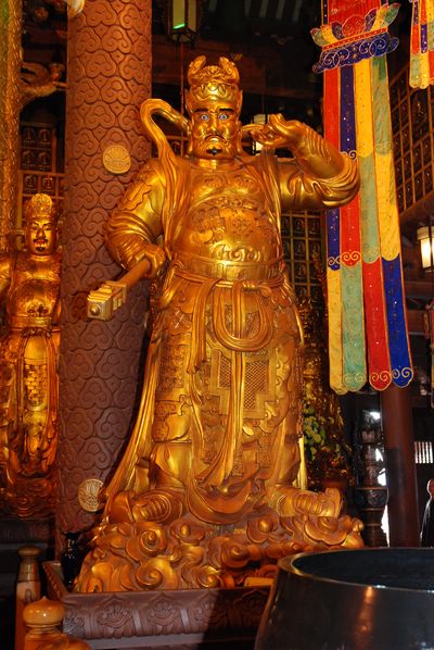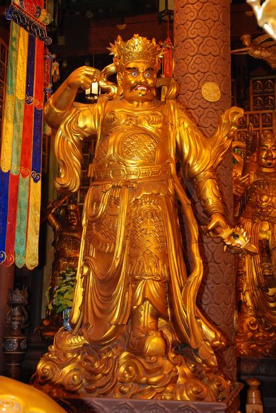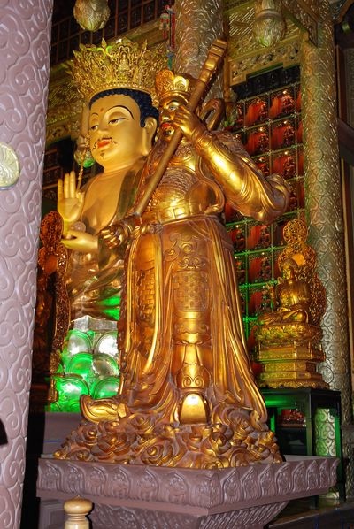 Trước cửa chánh điện có tạc hai tượng Kim Cang Lực Sĩ cao 6m, trông rất sống động với cái nhìn dữ dội, xoáy vào tâm can kẻ tà tâm nhưng vẫn là hiện thân của cái thiện.