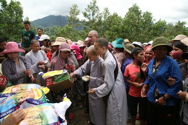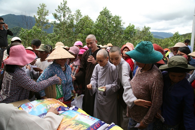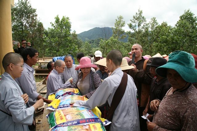 Chư Tôn đức Ni, quý Phật tử trong phái đoàn đã vượt hơn 1000km từ Tp.HCM đến Huế, và bắt đầu từ lúc mờ sáng đoàn lại tiếp tục vượt hơn 120km đường đồi núi hiểm trở trên dãy Trường Sơn với độ cao hơn 1500m. Với tình Pháp lữ, thương cái tâm đạo vì chúng sanh phụng sự của chư Tôn đức Tăng Ni trong ban Trị sự GHPGVN huyện A Lưới, cũng như thể hiện tinh thần “từ bi cứu khổ” của Đạo Phật và Đạo lý “lá lành dùm lá rách” của dân tộc Việt Nam.