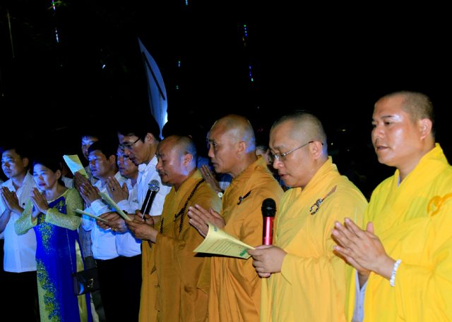 Phần cuối buổi lễ chư Tôn Đức niệm hương bạch Phật cầu nguyện quốc thái dân an và cùng lãnh đạo chính quyền cử hành nghi lễ tắm phật truyền thống trong tinh thần trang nghiêm nhất và cắt bánh Sinh Nhật Đấng Từ Phụ Thich Ca Mâu Ni ,/