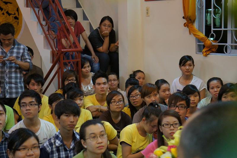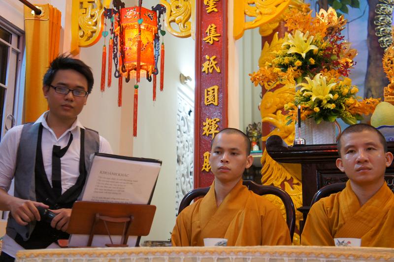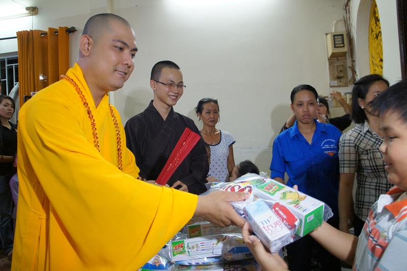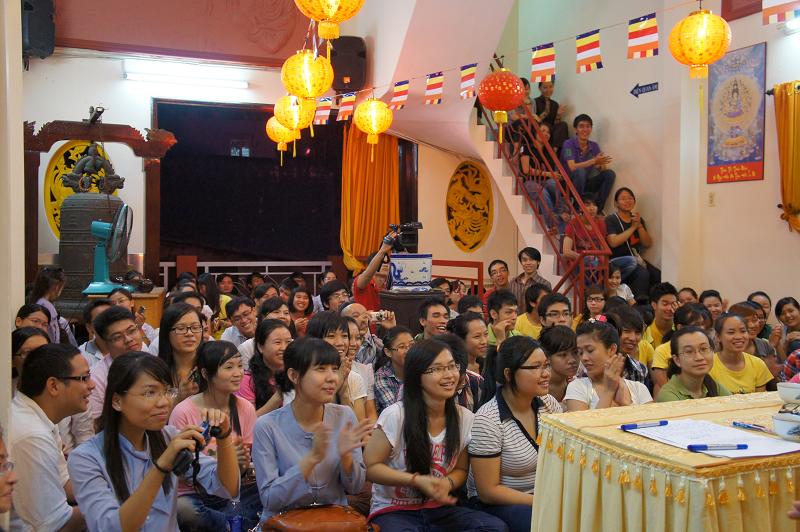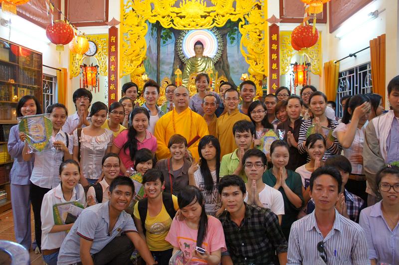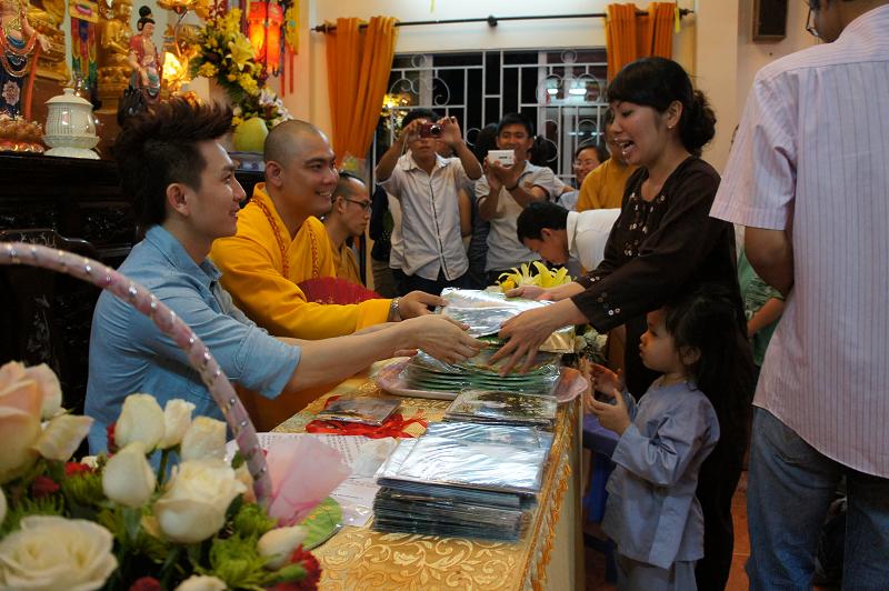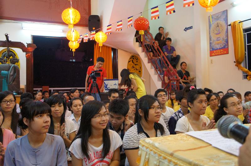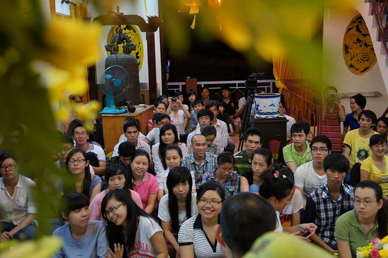Sau đó tại chánh điện bản tự, gần 100 bạn trẻ thích đi chùa tụng kinh và hoạt từ thiện trên trang mạng xã hội Facebook đã tham dự chương trình “NIỀM VUI TUỔI THƠ  – TÁCH TRÀ HỘI NGỘ”. Buổi lễ dưới sự chứng minh của ĐĐ. Thích Lệ Minh (Phó thường trực BĐD.PGQ5), cùng quý Thầy : Thích Pháp Như, Thích Lệ Bình, Thích Thiện Lạc, Thích Trung Nghiêm, sự góp mặt của ca sĩ Hùng Thanh, Phạm Quang Hiền.