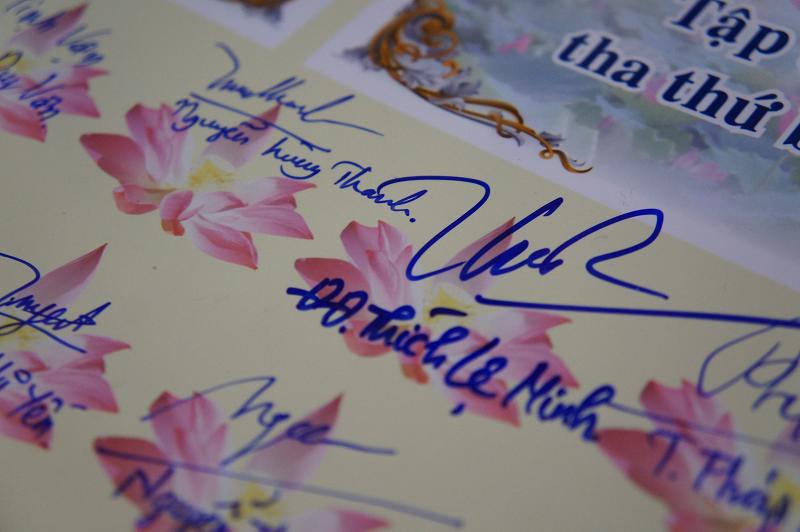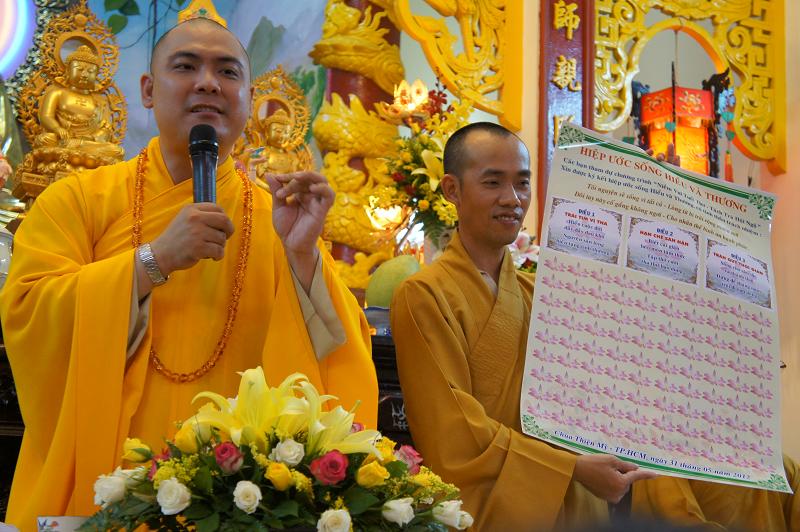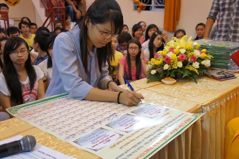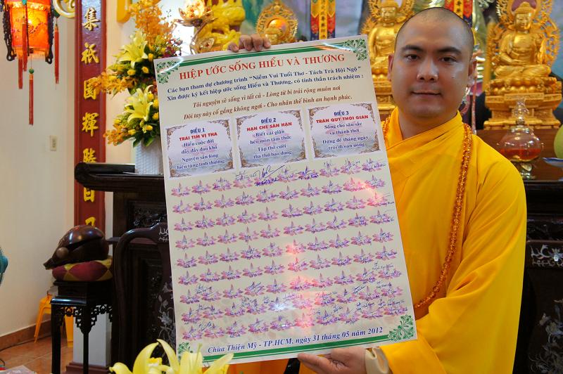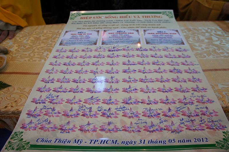 Cuối cùng là phần ký “Hiệp ước sống hiểu và thương” của 100 bạn thành viên tham dự buổi lễ với lời phát nguyện : Hiểu cuộc đời dẫy đầy đau khổ, nguyện sẵn lòng hiến tặng tình thương. Biết cái giận héo mòn tâm thức, tập thở cười tha thứ bao dung. Sống cho sâu sắc và thảnh thơi, đừng để tháng ngày trôi đi oan uổng.