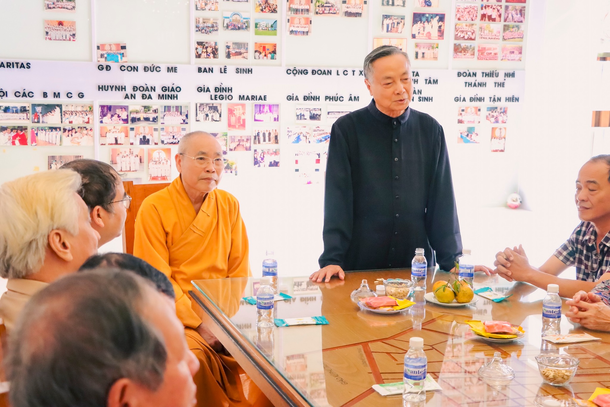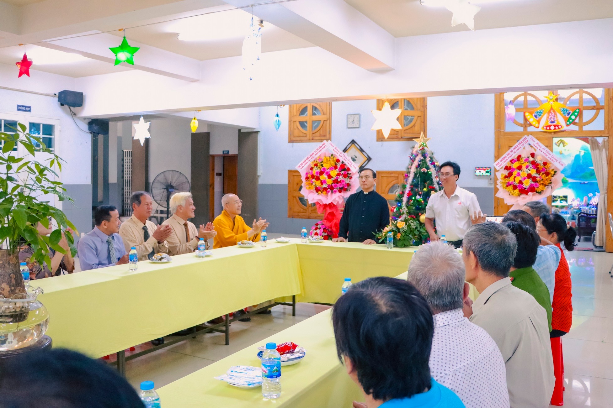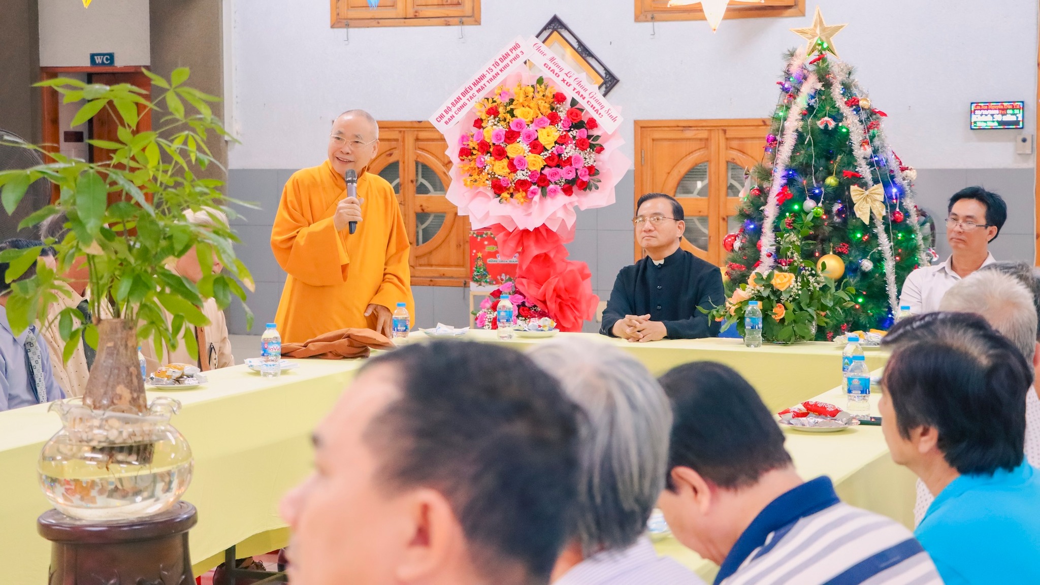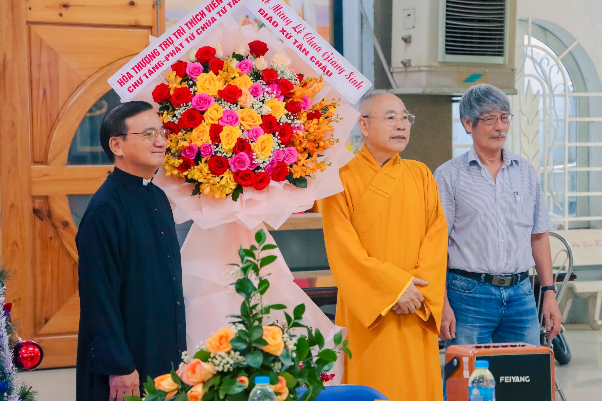 Hòa thượng Trụ trì đã thay mặt đoàn gửi lời chúc mừng và lẵng hoa đến các linh mục, hội đồng mục vụ và bà con giáo dân một mùa Giáng sinh ấm áp, an lành trong hồng ân của Thiên Chúa và một năm mới nhiều sức khỏe, an khang, thịnh vượng.