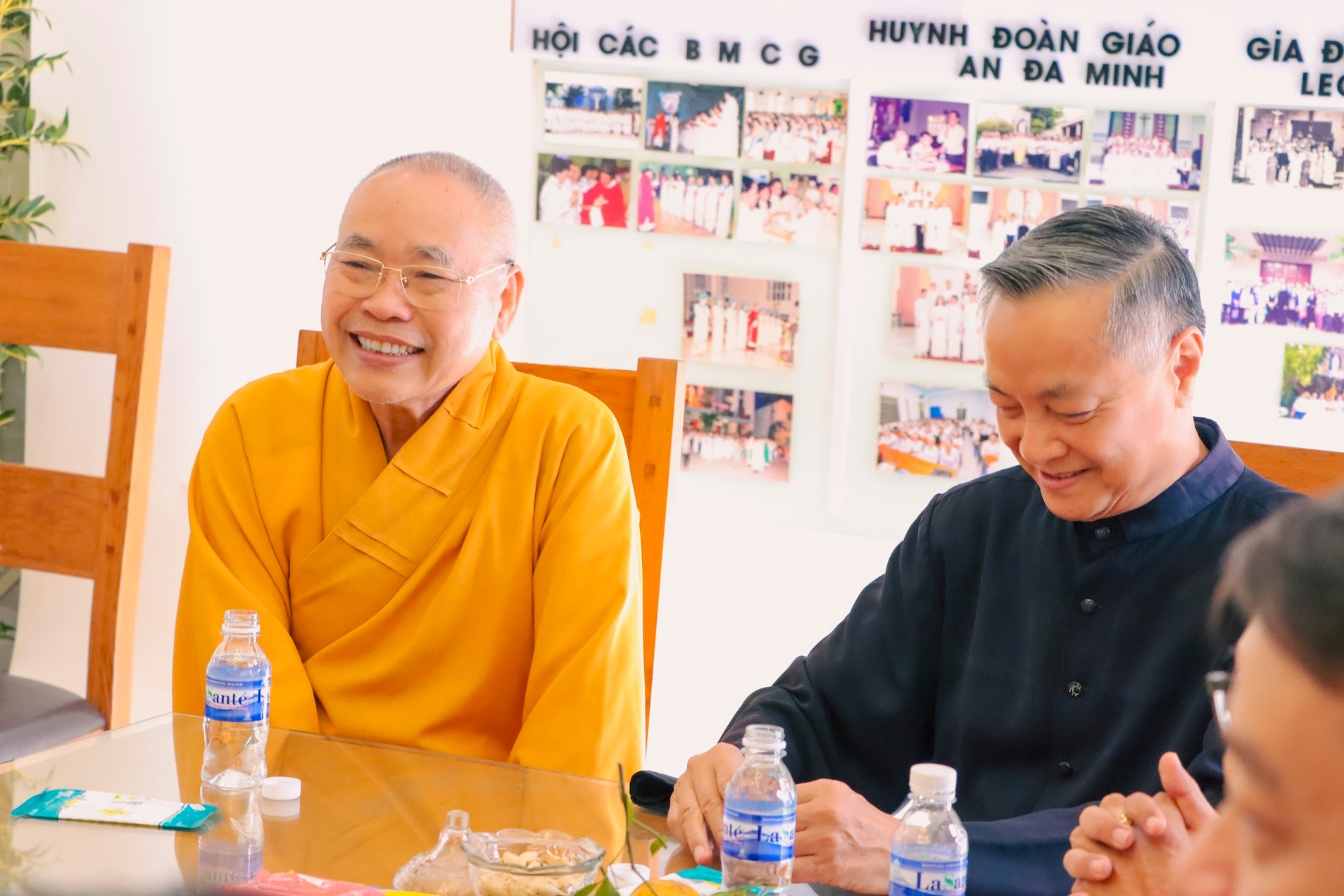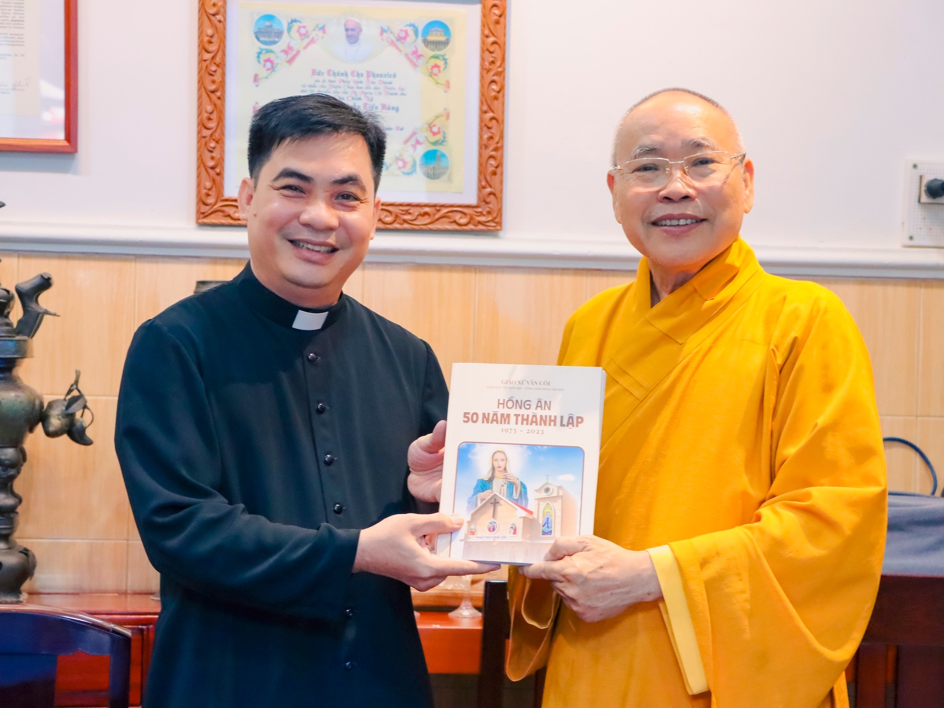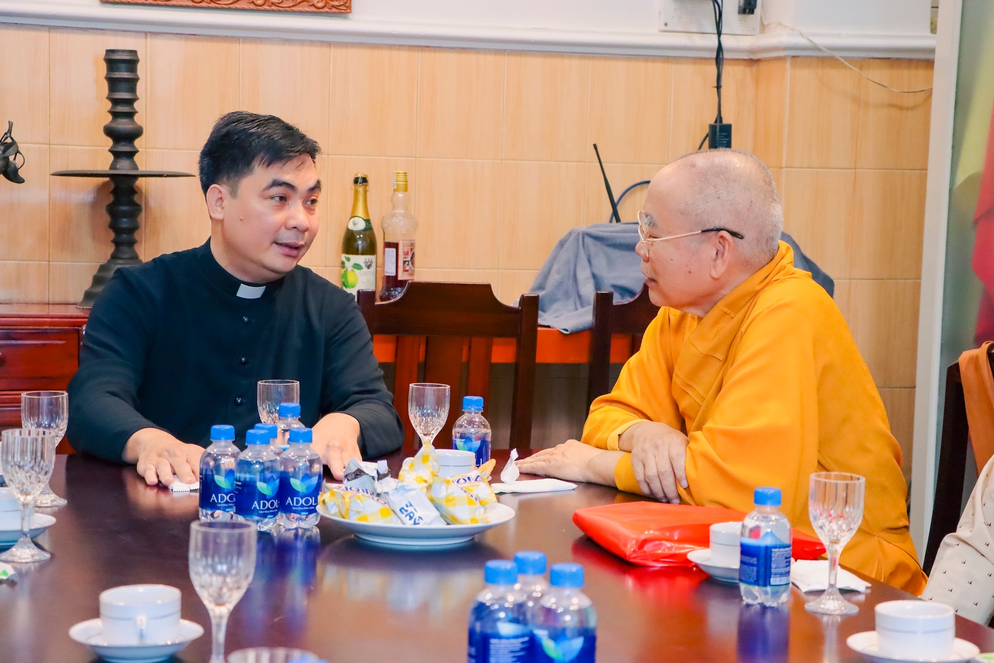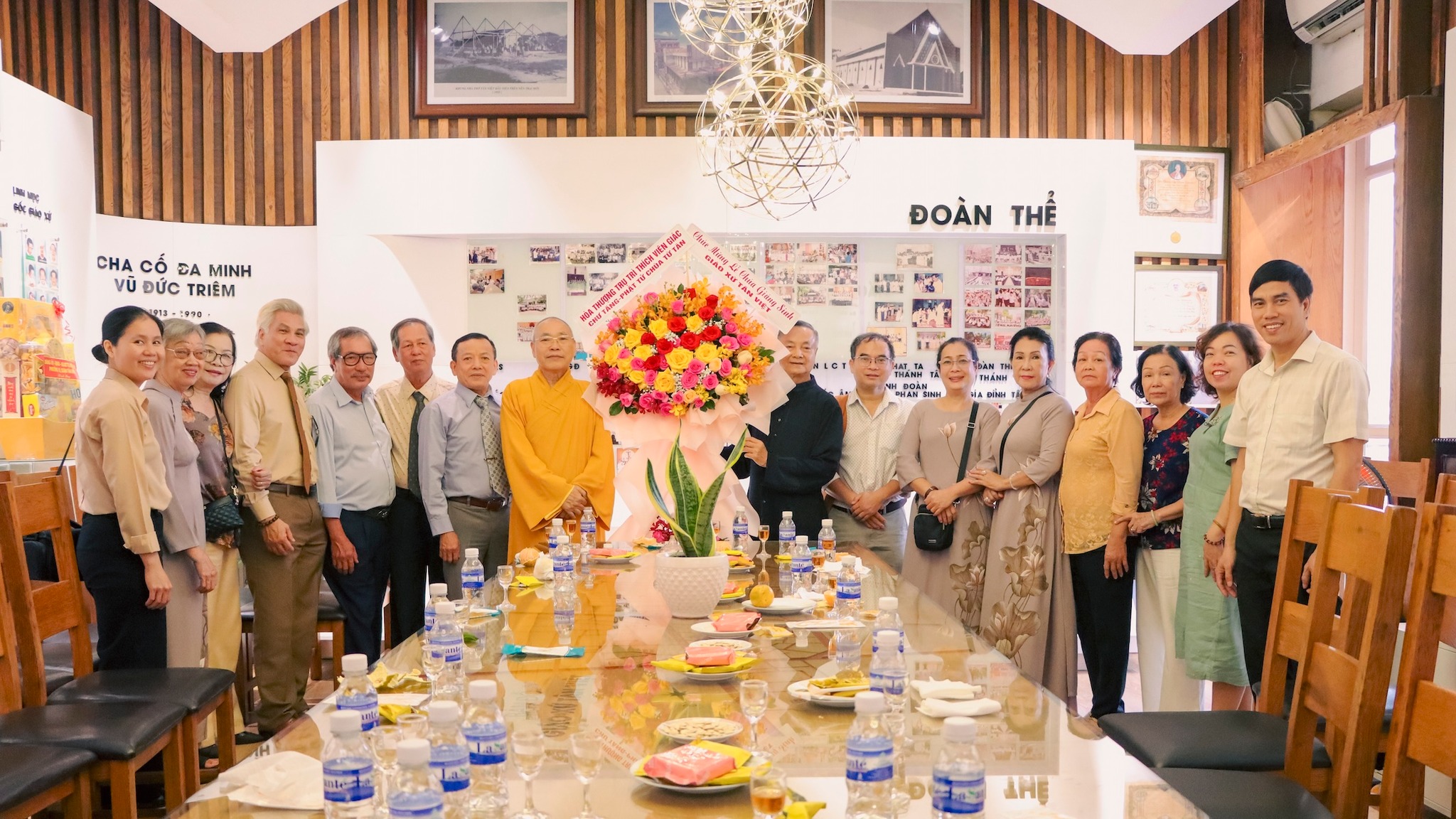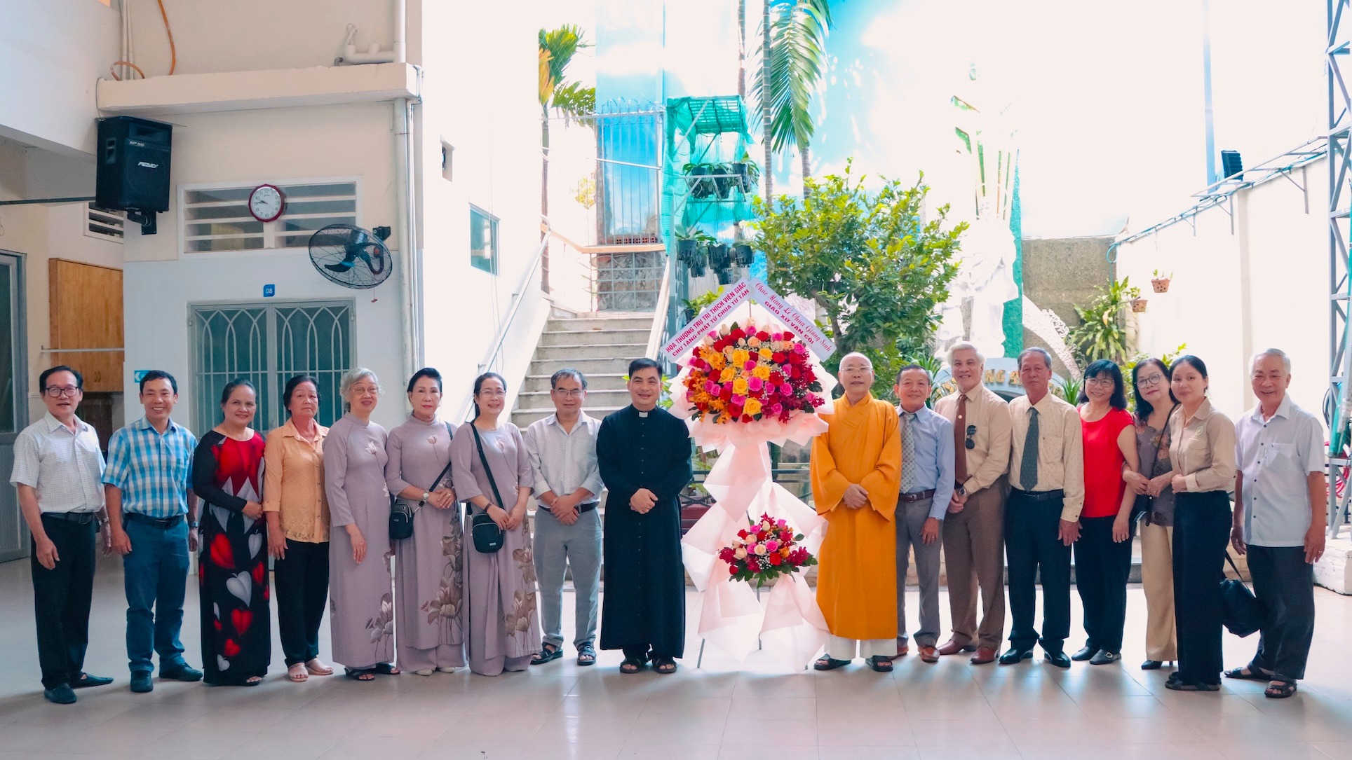 Hòa thượng Trụ trì đã thay mặt đoàn gửi lời chúc mừng và lẵng hoa đến các linh mục, hội đồng mục vụ và bà con giáo dân một mùa Giáng sinh ấm áp, an lành trong hồng ân của Thiên Chúa và một năm mới nhiều sức khỏe, an khang, thịnh vượng.