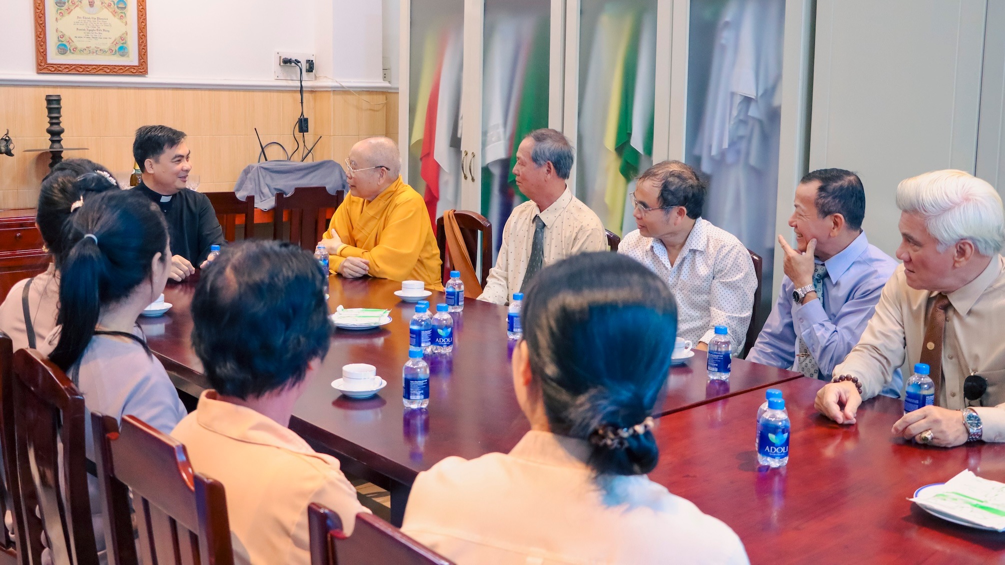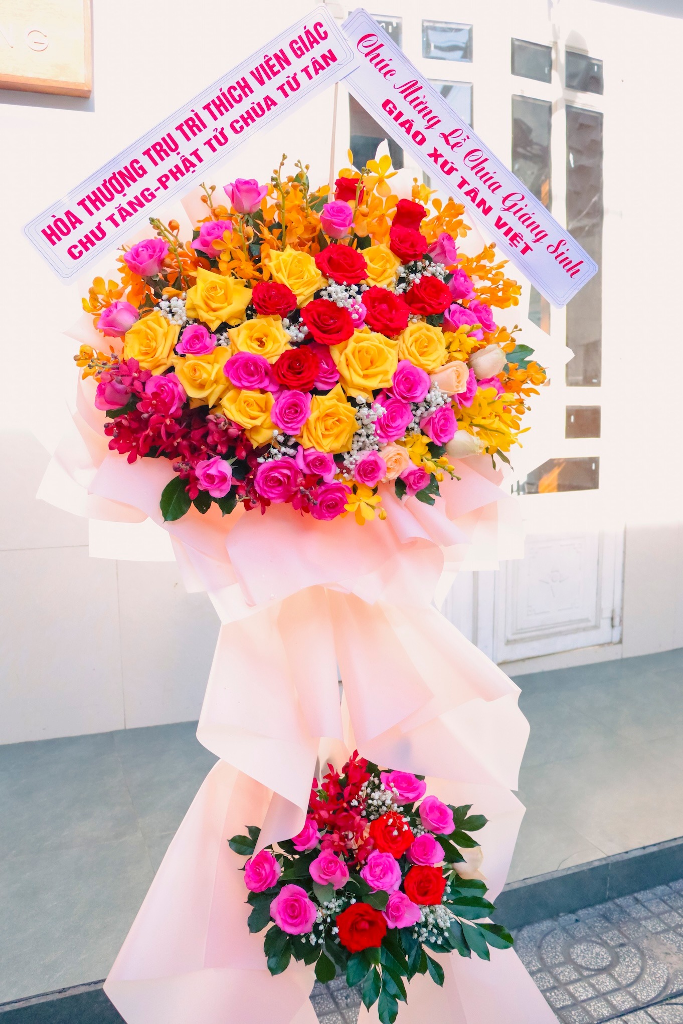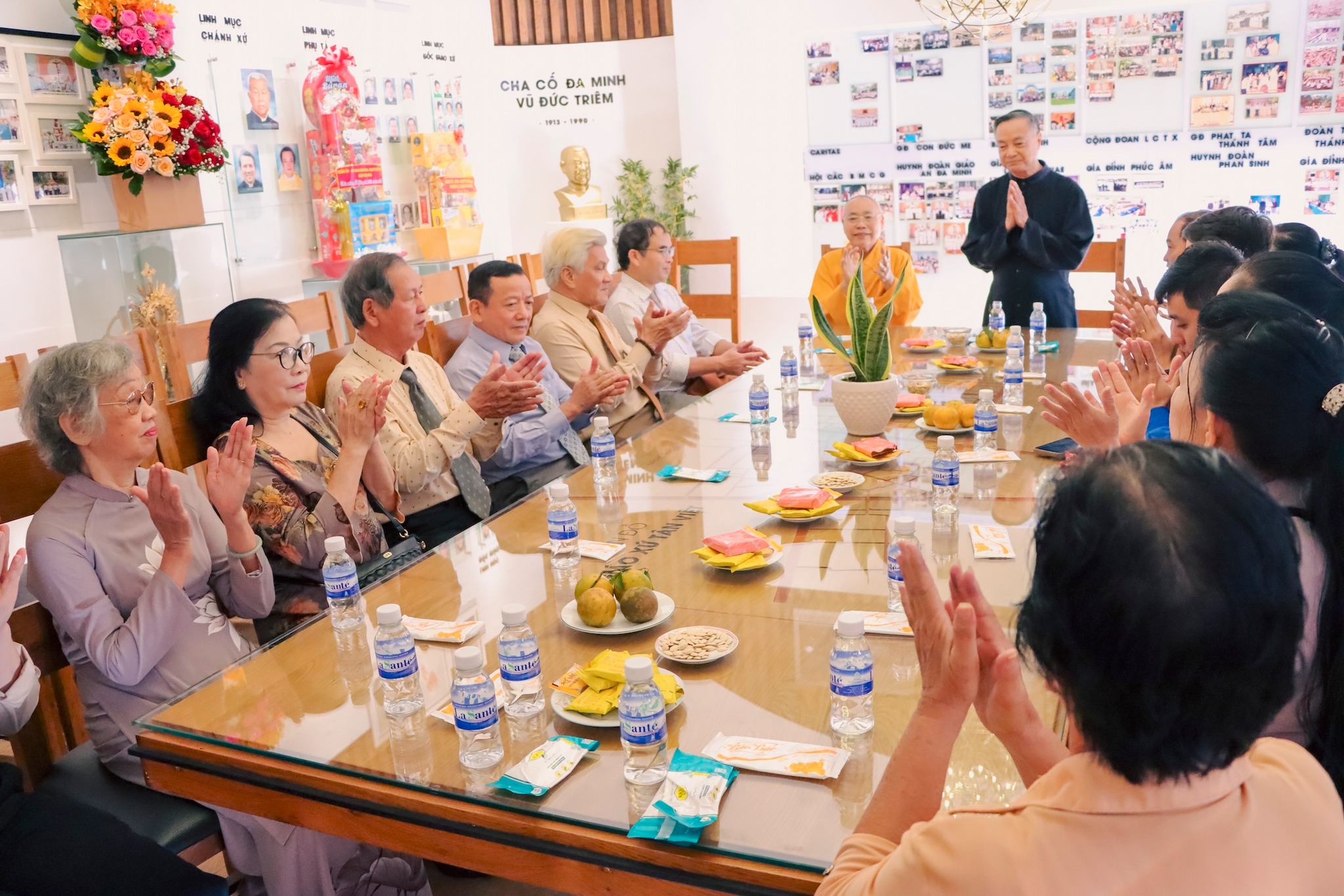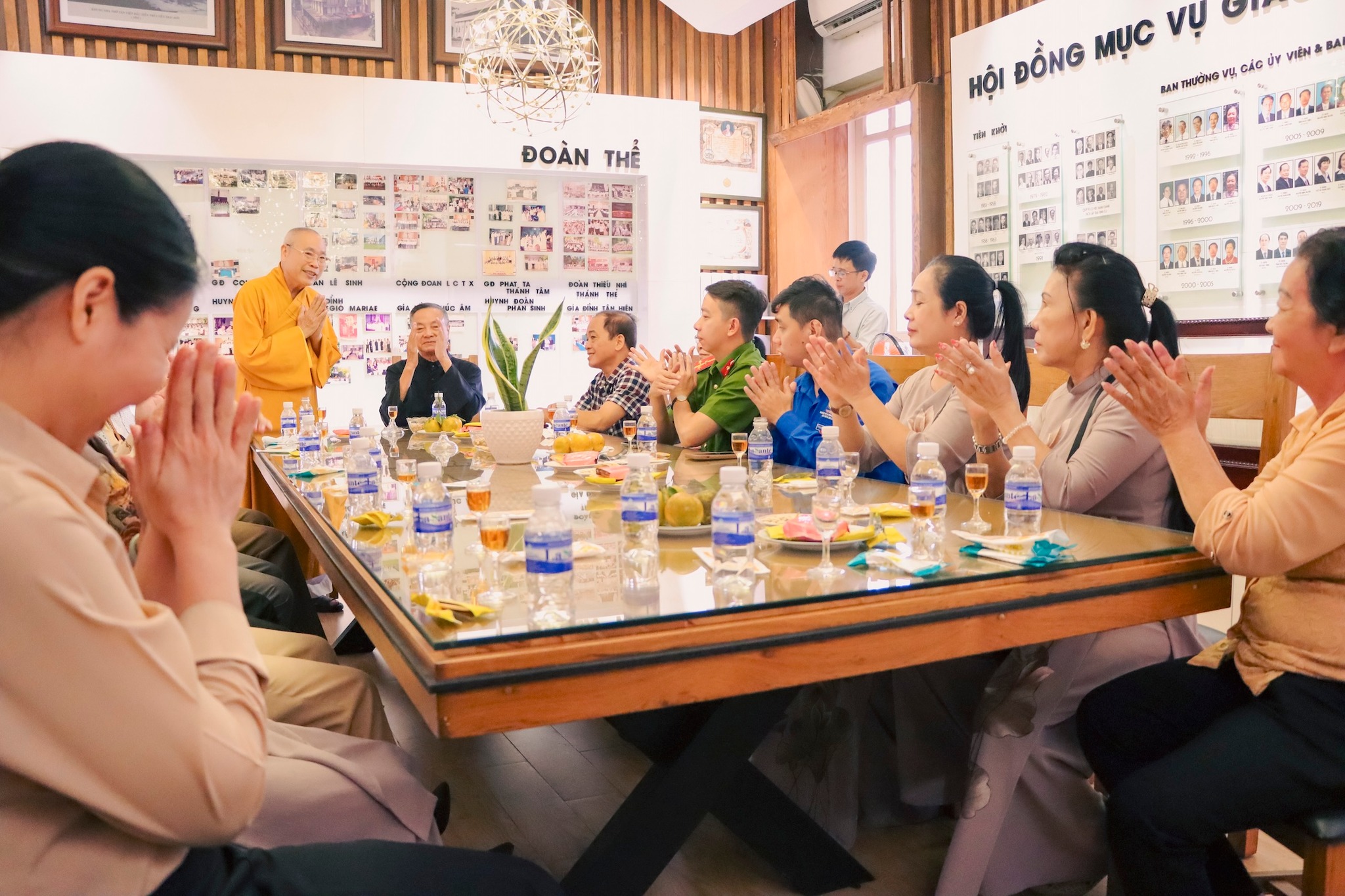 Hòa thượng Trụ trì đã thay mặt đoàn gửi lời chúc mừng và lẵng hoa đến các linh mục, hội đồng mục vụ và bà con giáo dân một mùa Giáng sinh ấm áp, an lành trong hồng ân của Thiên Chúa và một năm mới nhiều sức khỏe, an khang, thịnh vượng.