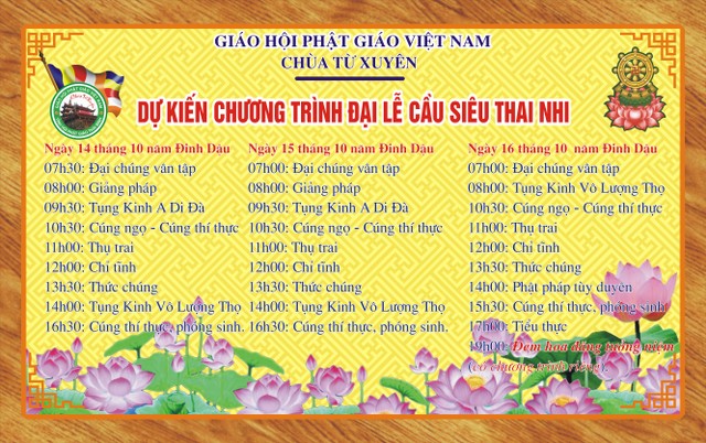 Đại lễ diễn ra trong ba ngày: từ 01 – 03/12/2017 (nhằm ngày 14 – 16/10/Đinh Dậu), quý Phật tử sẽ dự các thời khóa niệm Phật, tụng kinh cầu siêu, nghe giảng pháp chư Tăng bản tự chủ trì.