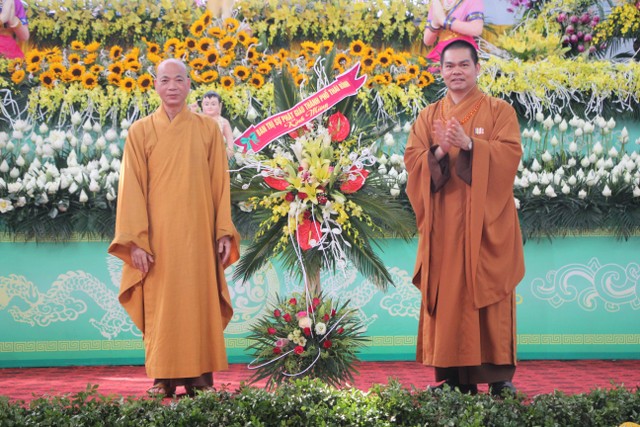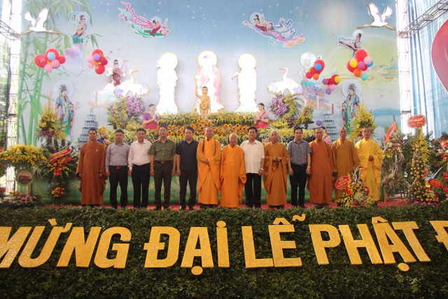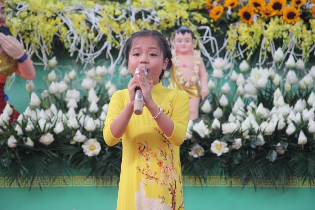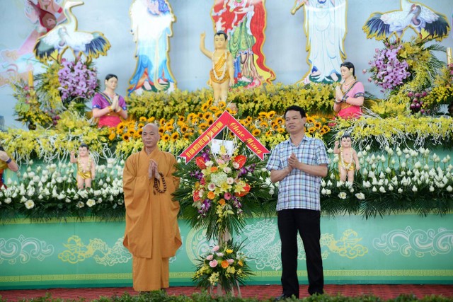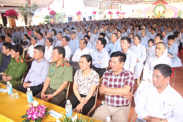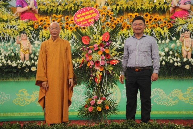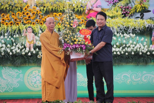 Sau các nghi lễ niệm Phật cầu gia bị, chào cờ, đạo ca, nhập từ bi quán, các bạn thanh niên Phật tử đã dâng hoa cúng dàng Đại lễ. TT.Thích Thanh Hòa thay mặt cho chư tôn đức tuyên đọc “Thông điệp của Đức Pháp chủ HĐCM GHPGVN gửi Tăng, Ni, cư sĩ Phật tử Việt Nam nhân dịp Đại lễ Phật đản PL.2562 – DL.2018”. Thông điệp nhắn gửi: “Kỷ niệm ngày Đức Phật đản sinh, ngược dòng lịch sử tự hào về sự đóng góp vĩ đại của các bậc Tổ sư đại trí cho dân tộc, Tăng Ni, Phật tử, tổ chức thành viên Giáo hội Phật giáo Việt Nam phải nâng cao tinh thần: “Trí tuệ – Kỷ cương – Hội nhập – Phát triển”, nỗ lực không ngừng làm cho Đạo Phật xương minh, tiếp tục đóng vai trò quan trọng trong khối đại đoàn kết dân tộc, tích cực trong sự nghiệp xây dựng và bảo vệ Tổ quốc Việt Nam, góp phần đem lại cuộc sống an lạc, thịnh vượng cho nhân dân, hòa bình cho nhân loại.”. Dịp này, chư tôn đức chứng minh, quý quan khách, đại diện Phật tử đã tặng hoa chúc mừng BTS PG huyện nhân dịp Đại lễ Phật đản. Chương trình Đại lễ còn một số tiết mục văn nghệ có sự tham gia của các ca sỹ, nghệ sỹ: Văn Tuấn – Hằng Nga, Đàm Thu Thủy, Thế Duyên, Quang Huy, bé Tú Thanh…