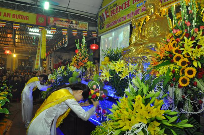 Mở đầu chương trình là nghi thức dâng hoa cúng dường của các bạn Thanh thiếu niên Phật tử chùa Tương Mai.