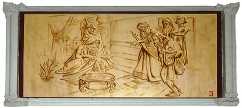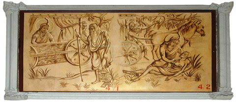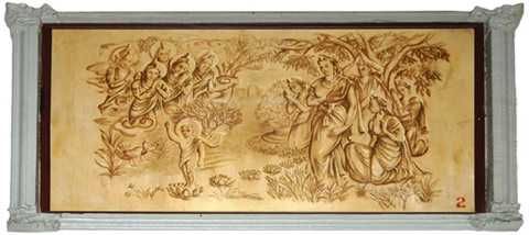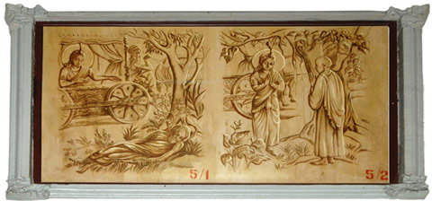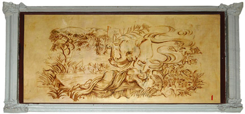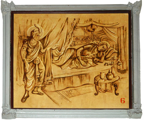 Bộ tranh Lịch sử Đức Phật: Hoàng hậu Ma Gia nằm mộng thấy voi trắng sáu ngà chen vào hông bên phải, sau đó thụ thai