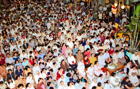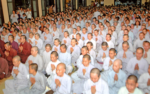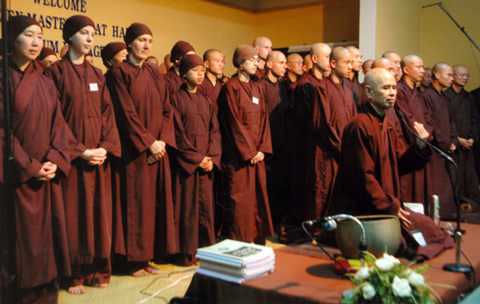 Đông đảo chư Tăng Ni và Phật tử nghe Thiền sư Nhất Hạnh giảng pháp
