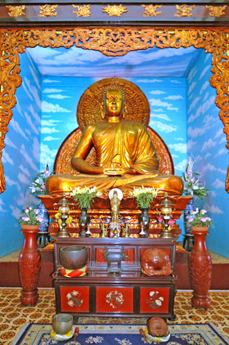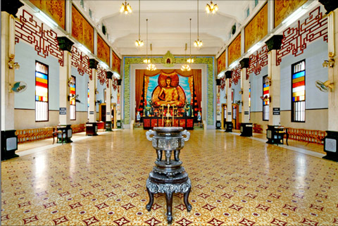 Chánh điện ở lầu 1 được bài trí tôn nghiêm. Tượng đức Phật Thích Ca được tôn trí tại đây là một tác phẩm mỹ thuật bằng đá nhân tạo màu hồng, cao 6,5m do ông Chánh Trí Mai Thọ Truyền đặt họa sĩ, điêu khắc gia Lê Văn Mậu tạc. Tượng đức Phật được làm lễ an vị vào ngày 12-2-1958 (24-12 năm Đinh Dậu). Pho tượng đã được tạp chí ASIA giới thiệu khắp thế giới thời bấy giờ.