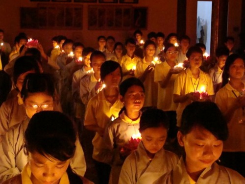 Các em tham gia nghi lễ thắp nến cầu nguyện cho quê hương. Nơi nào có ánh sáng nơi đó bóng đêm bị xua tan. Cũng vậy nơi nào có tình thương thì nơi đó mất đi sự đau khổ. Đẹp thay! Ngọn nến đã làm thay công việc của ngôn từ.