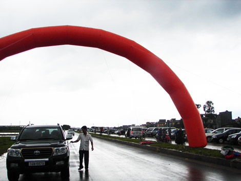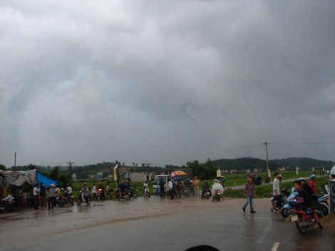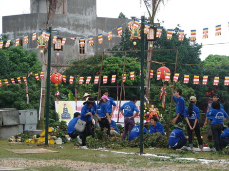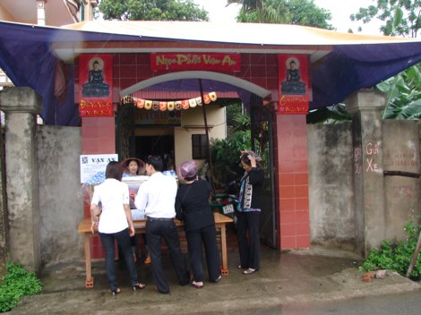 Trú mưa tại cổng tam quan dựng tạm