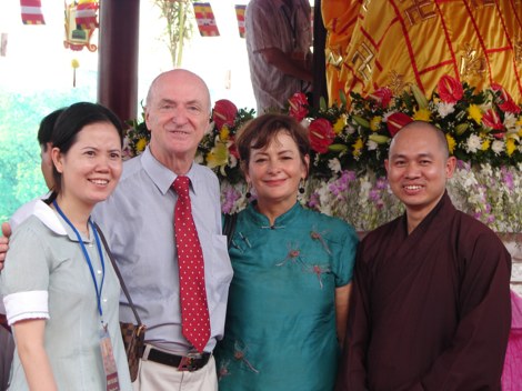Đại đức Thích Đức Thiện (phải) và nhà tài trợ (trái) chụp hình lưu niệm với vợ chồng ông bà Ian Green