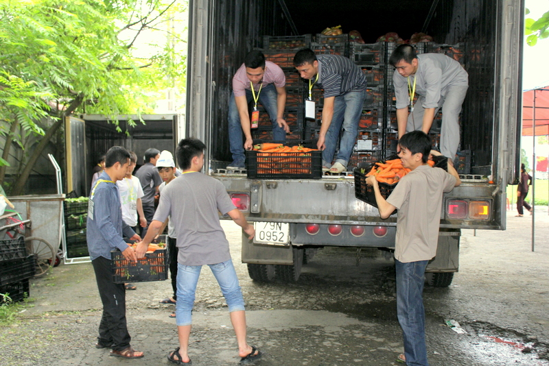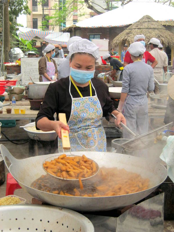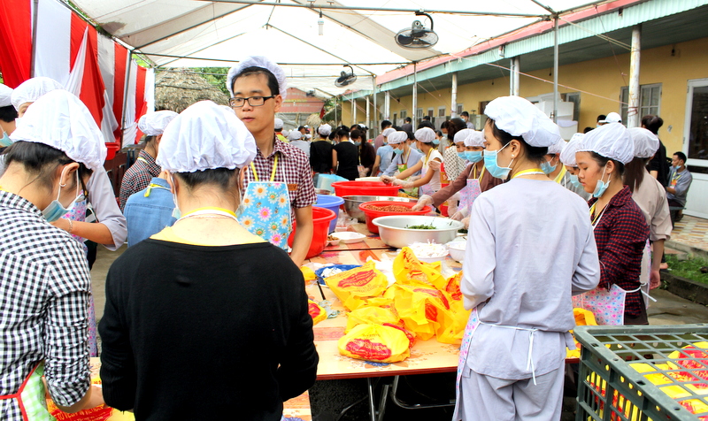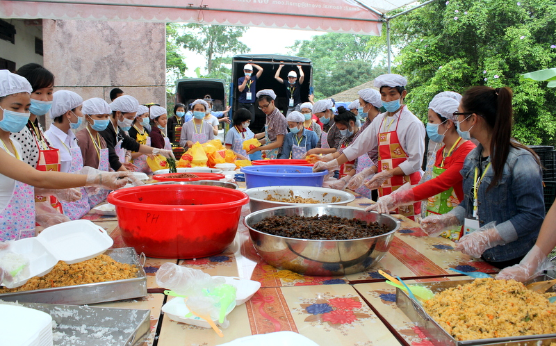 Tại khu vực của Tiểu ban Trai soạn, công việc được phân chia theo khu vực rõ ràng. Các TNV nữ có tuổi thì chịu trách nhiệm nhặt rau, cắt gọt củ, quả. Các Bác nam thì vận chuyển và phân loại rau củ ra từng khu vực để bảo quản. Khu nấu ăn chỉ có từ 1 – 2 người đứng 1 bếp. Khổi lượng thức ăn khá lớn nên các TNV nấu ăn rất vất vả. Đây có lẽ là công việc vất vả nhất trong Tiểu ban Hậu cần. Thức ăn được nấu liên tục nên mọi người không được nghỉ tay. Mới sáng sớm nhưng mặt ai cũng lấm tấm mồ hôi vì cái nóng của thời tiết, của ga bếp, của thức ăn,.. Mọi người chỉ vội lau qua loa rồi lại tiếp tục công việc của mình.