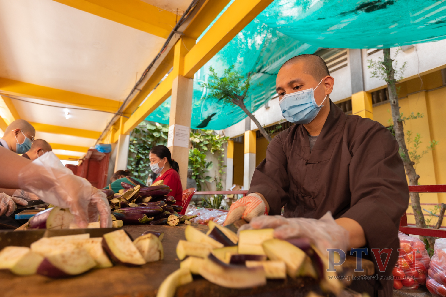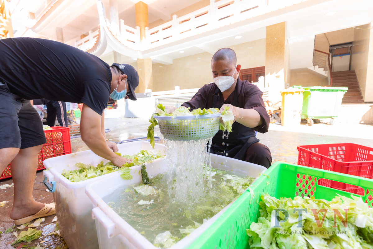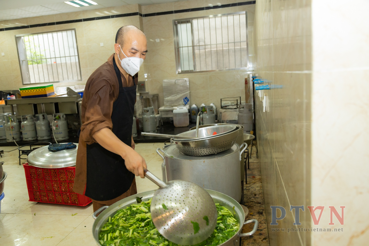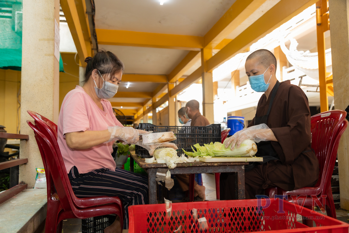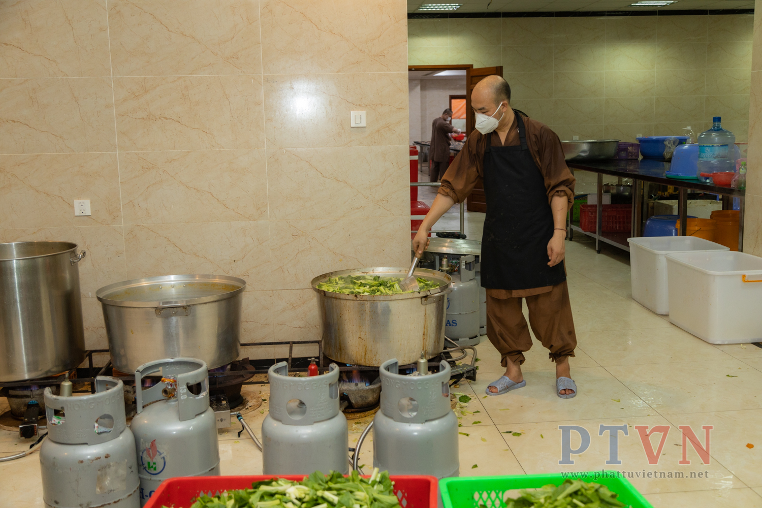 Công việc của bếp ăn tại chùa phân chia cụ thể theo từng khâu vận chuyển, sơ chế, xào nấu, đóng hộp,… được thực hiện bởi hơn 90 vị Tăng Ni và hơn 120 Phật tử, tình nguyện viên. Toàn bộ nhân sự tham gia phục vụ bếp ăn được bố trí nơi ăn ngủ tại chùa. Mỗi ngày, bếp ăn sử dụng hơn 1,2 tấn gạo.