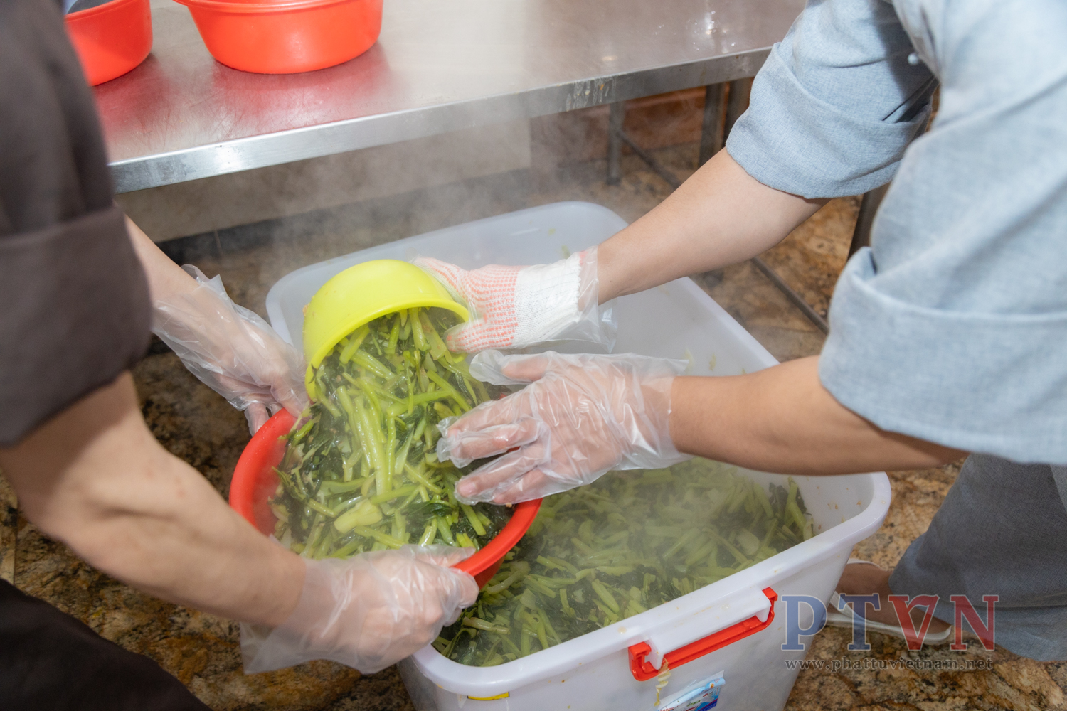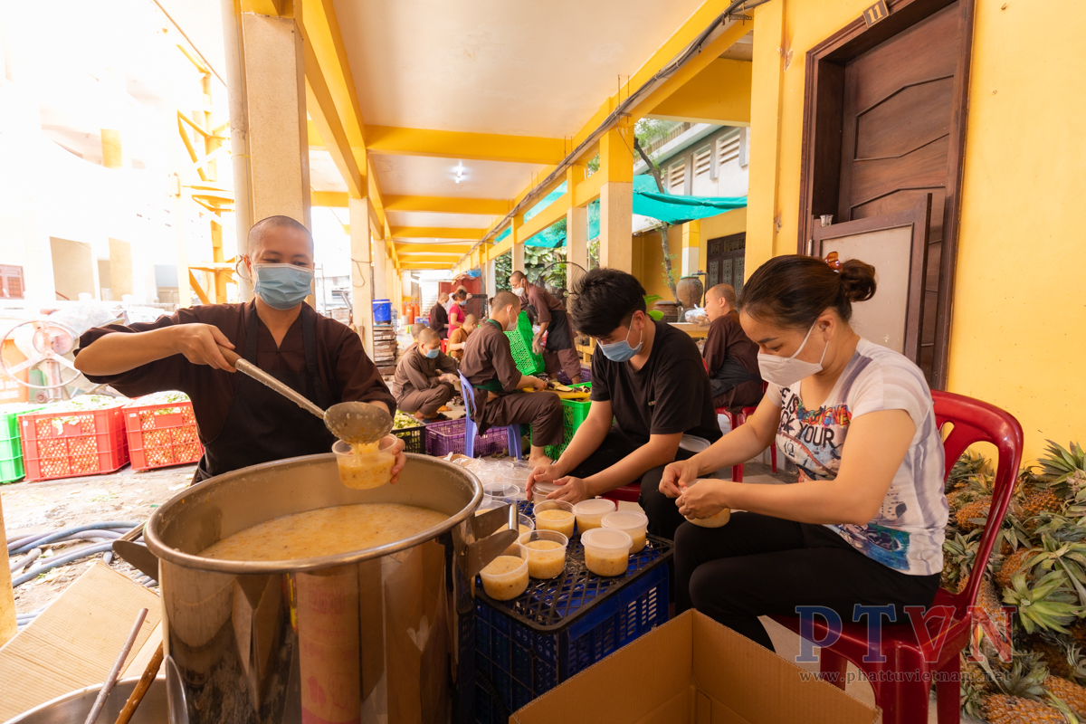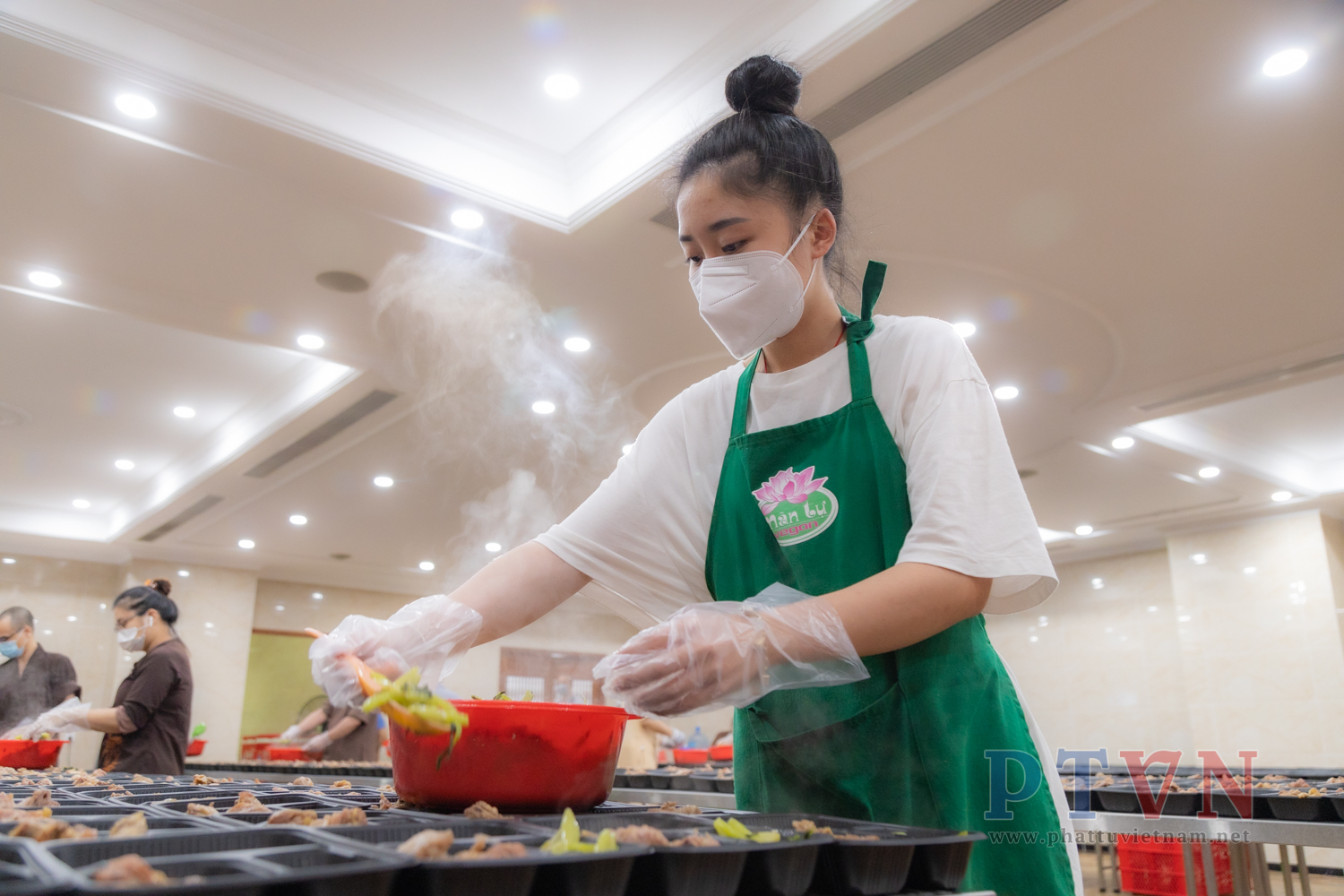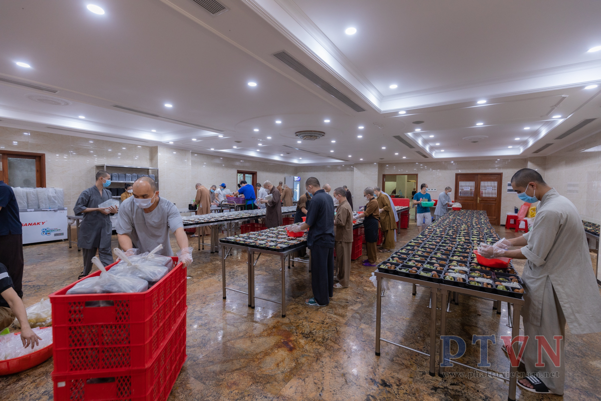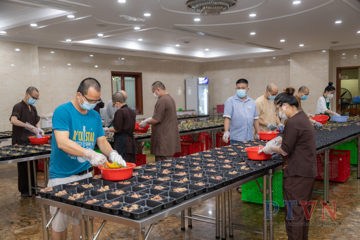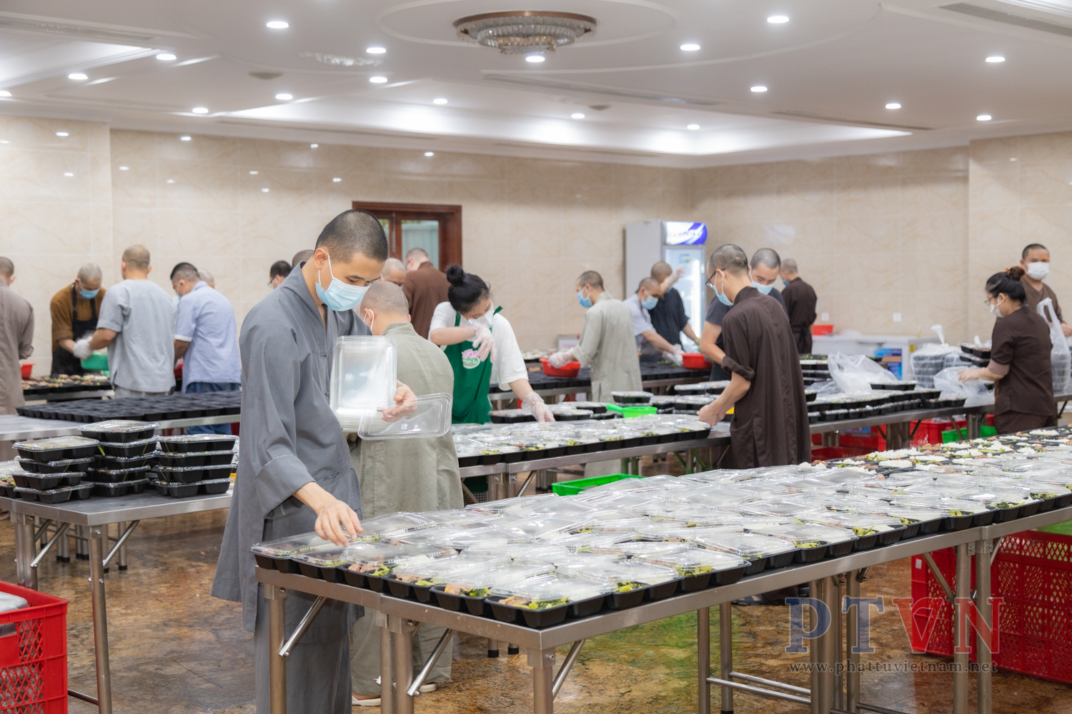 Công việc của bếp ăn tại chùa phân chia cụ thể theo từng khâu vận chuyển, sơ chế, xào nấu, đóng hộp,… được thực hiện bởi hơn 90 vị Tăng Ni và hơn 120 Phật tử, tình nguyện viên. Toàn bộ nhân sự tham gia phục vụ bếp ăn được bố trí nơi ăn ngủ tại chùa. Mỗi ngày, bếp ăn sử dụng hơn 1,2 tấn gạo.