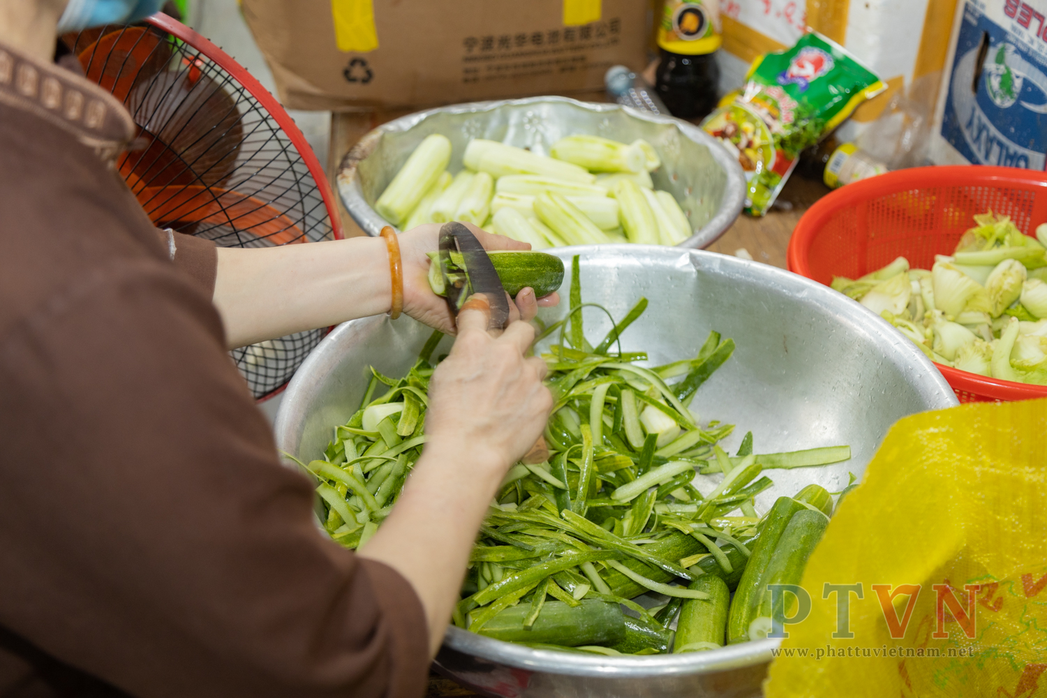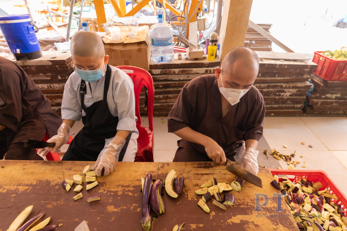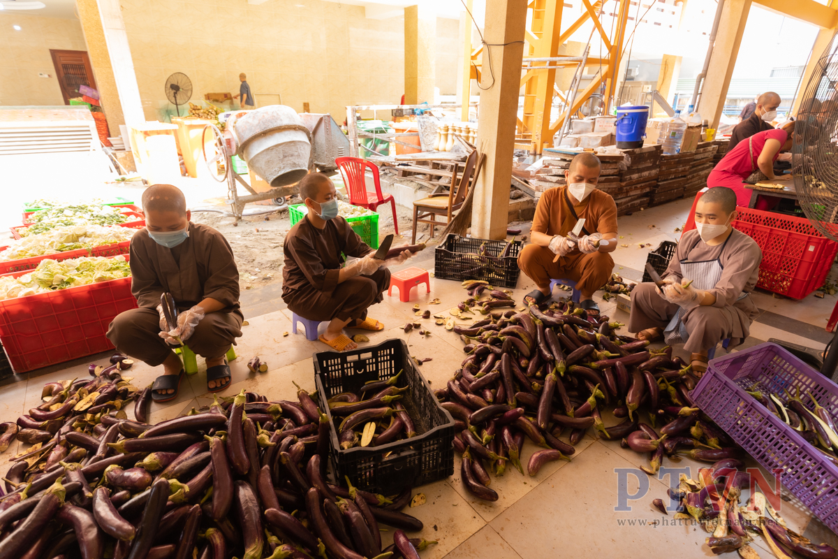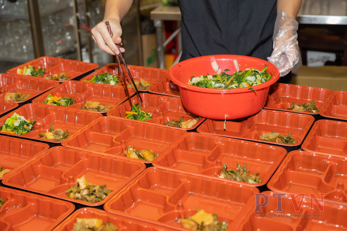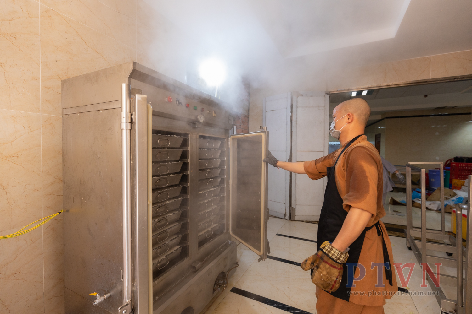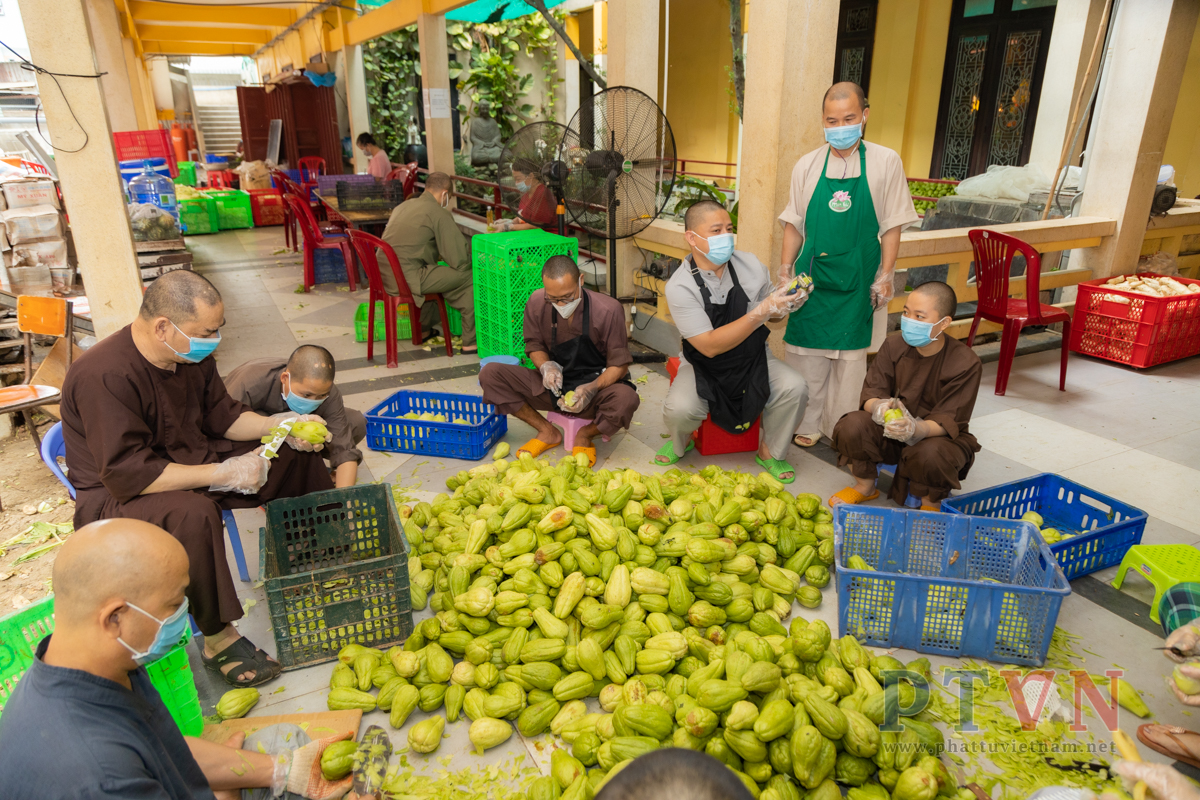 Công việc của bếp ăn tại chùa phân chia cụ thể theo từng khâu vận chuyển, sơ chế, xào nấu, đóng hộp,… được thực hiện bởi hơn 90 vị Tăng Ni và hơn 120 Phật tử, tình nguyện viên. Toàn bộ nhân sự tham gia phục vụ bếp ăn được bố trí nơi ăn ngủ tại chùa. Mỗi ngày, bếp ăn sử dụng hơn 1,2 tấn gạo.