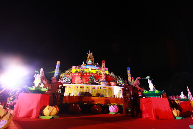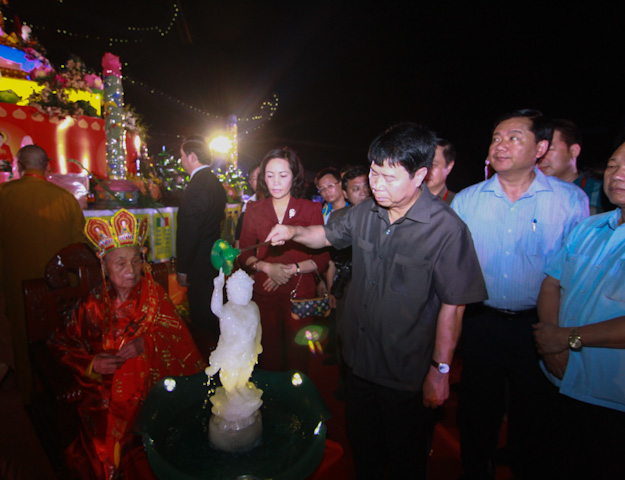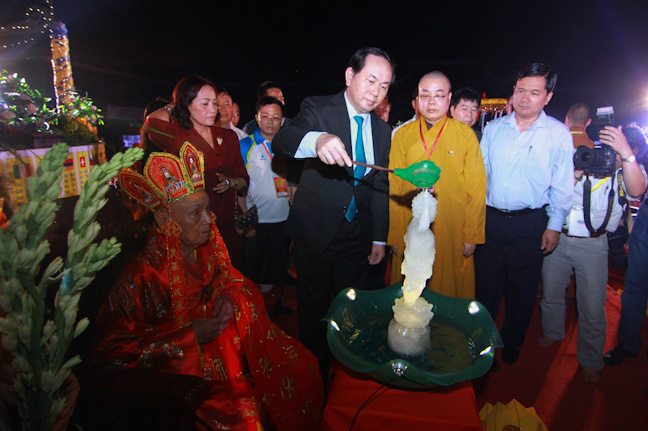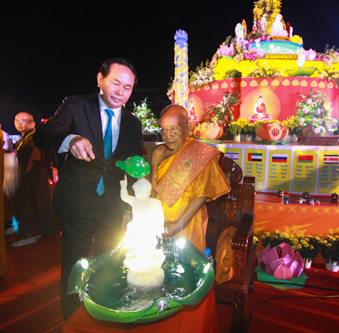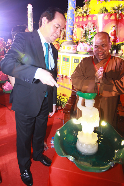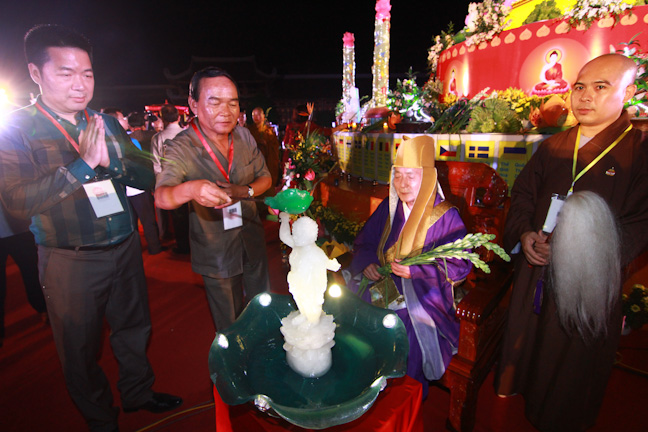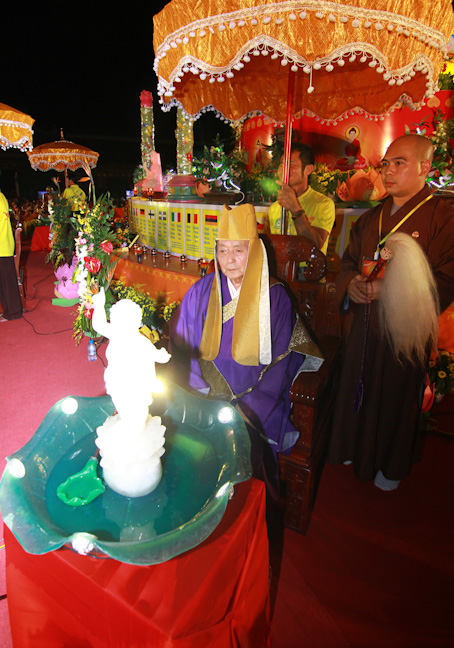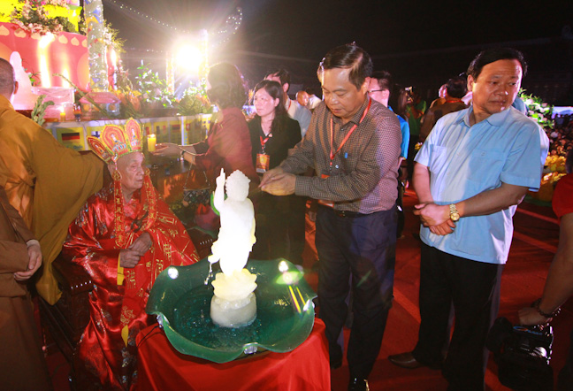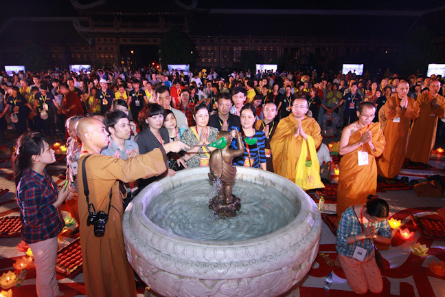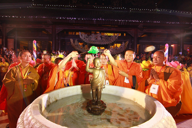 Tiếp tục là nghi thức tắm Phật được thực hiện theo văn hóa đặc trưng của Phật giáo. Chư tôn đức lãnh đọa giáo hội, chư tăng lãnh đạo các nước trên thế giới cùng các Ngài Nguyễn Thiện Nhân, Trần Đại Quang, Đinh Tiến Dũng, Đinh La Thăng, Nguyễn Thị Thanh và quý vị lãnh đạo đảng, nhà nước thực hành nghi thức niêm hương, dâng hoa cúng Phật, tắm đức Phật sơ sinh cầu nguyện thế giới hòa bình, nhân dân ấm no hạnh phúc.