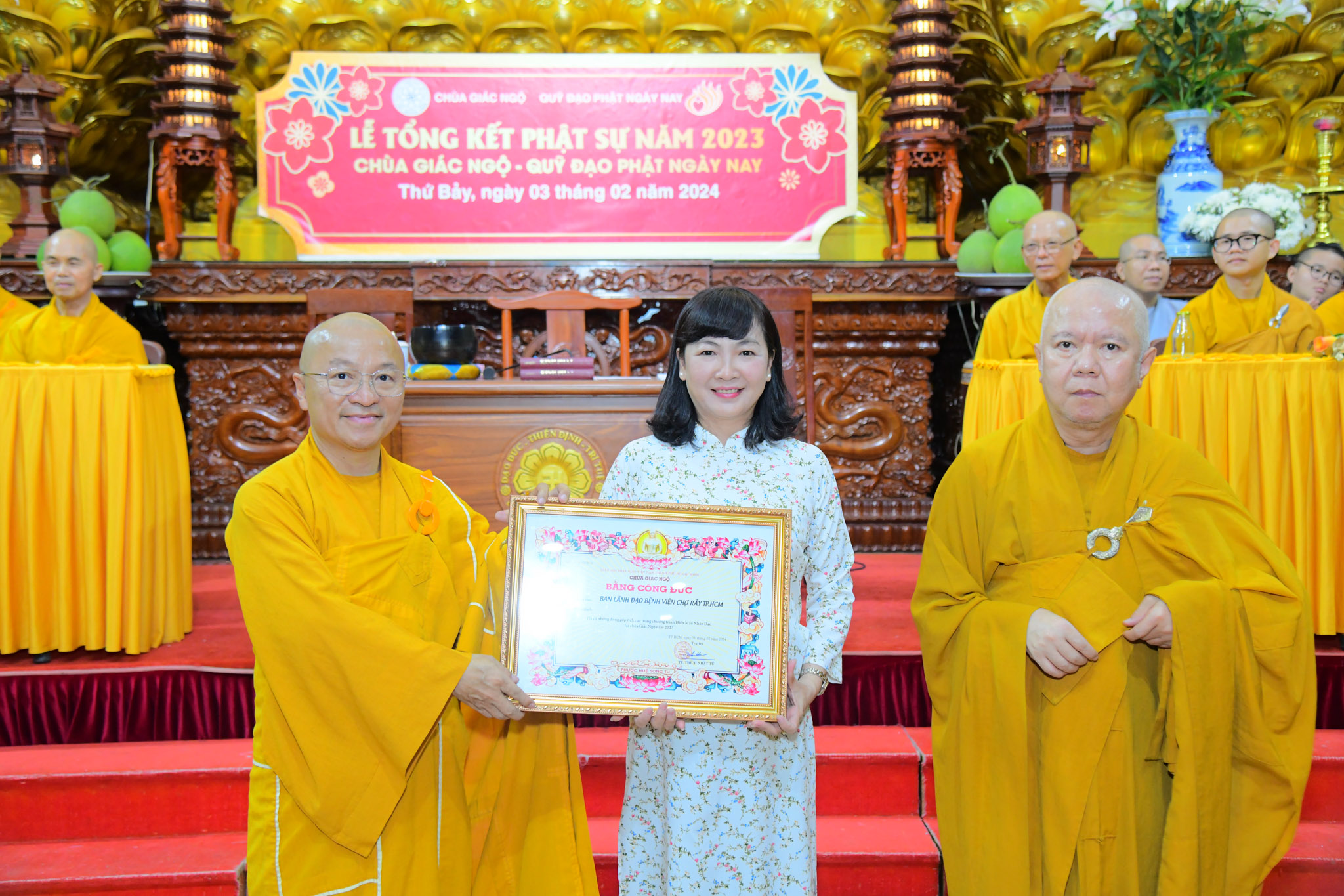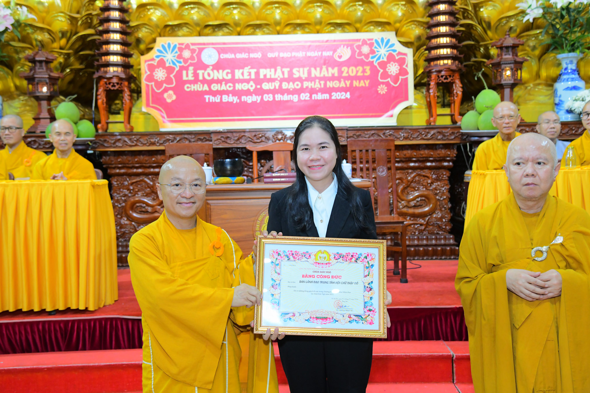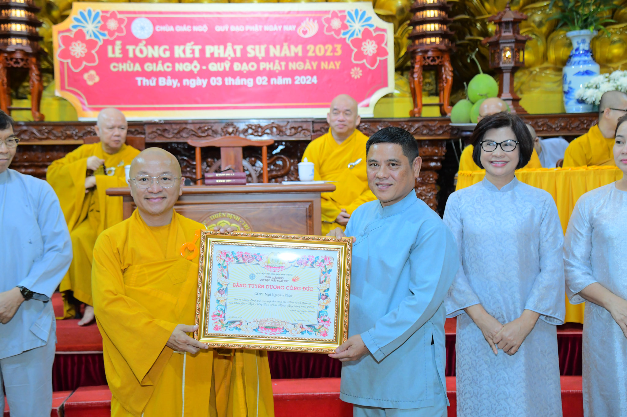 Các hoạt động này sẽ đóng góp không nhỏ vào công tác an sinh xã hội của nhiều địa phương trong toàn quốc. Sau phần đạo từ, Thượng toạ Trụ trì đã trao bằng tuyên dương công đức đến quý Phật tử đồng Phó Chủ tịch, quý Phật tử thành viên Quỹ Đạo Phật Ngày Nay; tuyên dương công đức quý Phật tử phát tâm đóng góp biên soạn, ấn hành Tam Tạng Thánh Điển Việt Nam; tuyên dương công đức các nhóm phụng sự viên, các ban hỗ trợ Phật sự chùa Giác Ngộ.