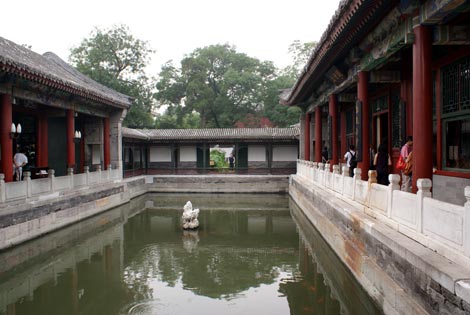 Bên trong chùa Vĩnh An, cách bày trí rất đẹp, mang đậm phong cách hòang gia. Điện trên cùng được lợp ngói lưu ly có 2 màu vàng, xanh, các mái, nóc điện được chạm trổ hình rồng rất đẹp mắt. Sự bày trí và phối cảnh đan xen giữa núi đá, đình đài, ngự uyển, cùng với những kiến trúc điêu khắc độc đáo khác tạo cho đảo Quỳnh Hoa thành một thể thống nhất, hài hòa, thánh thóat, thi vi, rất phù hợp cho du khách thưởng ngọan, và là điểm đến an tịnh tâm hồn cho người dân Bắc kinh muốn tìm về chốn Phật.