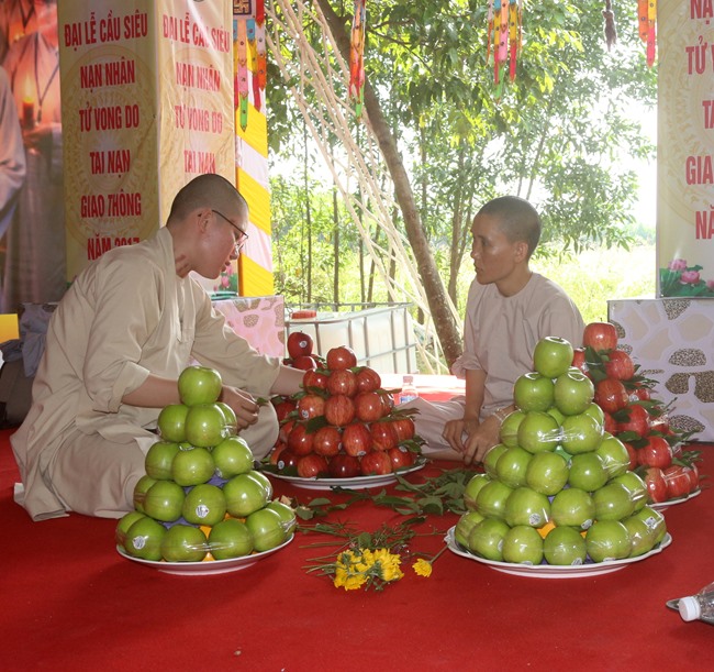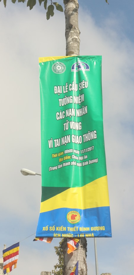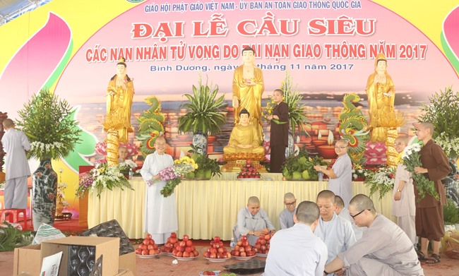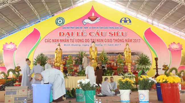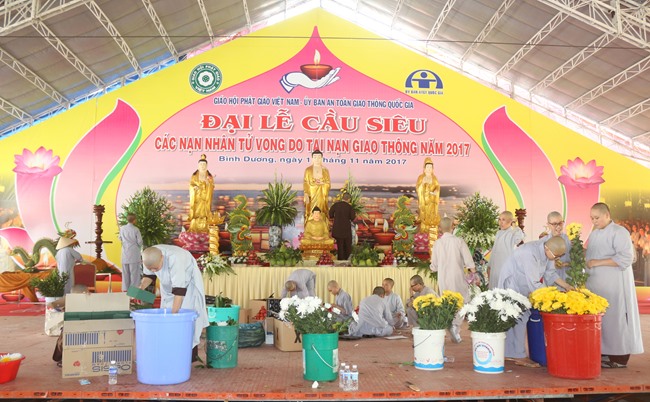 Các khâu như ban nghi lễ, ban trang trí khánh tiết, các pano, biểu ngữ, cờ phướn đã được trang hoàng và các công tác hậu cần phục vụ cho Đại lễ cũng trong tư thế sẵn sàng đón chào CTĐ lãnh đạo HĐTS, CTĐ Tăng Ni trong và ngoài tỉnh Bình Dương, lãnh đạo các cơ quan Đảng, ban thuộc Tỉnh ủy, các sở ban ngành thuộc UBND tỉnh, quý phật tử, thân nhân những người không may tử nạn vì TNGT, quý quan khách, các cơ quan thông tấn báo chí, báo đài và gần 10.000 người về tham dự Đại lễ cầu siêu.