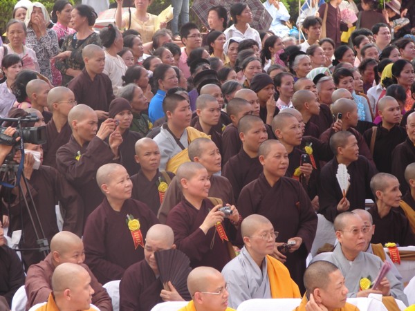 Các em chắp tay thành kính khi xe hoa diễu qua trước lễ đài. Đó cũng là một bài học về Phật pháp cho người xem