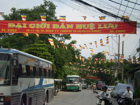 Cờ Phật trang hoàng trên đường vào chùa Phổ Quang