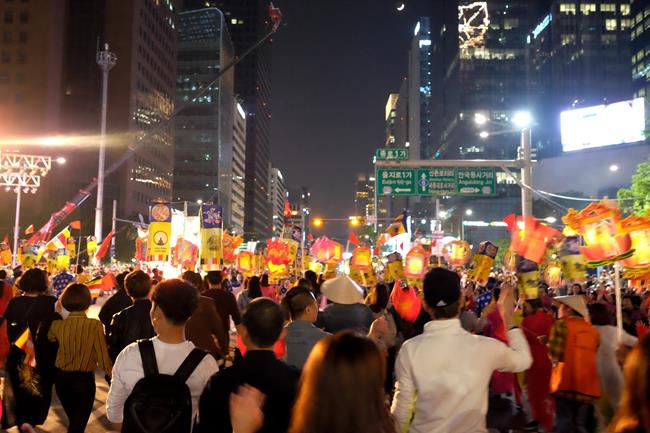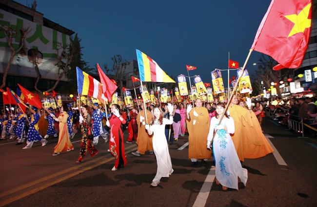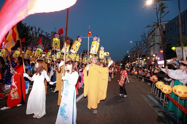 Người Hàn gọi Phật Đản là “Ngày Đức Phật đến” (부처님 오신 날, Bucheonim osin nal). Mình thích cách gọi giản dị này, bởi giản dị mà mang ý nghĩa rất thiêng liêng. Đức Phật đã đến với nhân gian trong ánh hào quang ngời sáng và kể từ giây phút đó, những người con Phật đã được che chở trong vầng mây Chánh pháp. Vì vậy, với người dân xứ này, Phật Đản thực sự là một ngày hội lớn, mang tầm quốc gia, có sức hút mạnh mẽ và có tầm ảnh hưởng sâu rộng đến nhiều tầng lớp trong xã hội. Ngoài những nghi thức đặc biệt của Phật giáo (như tụng kinh, rước Phật, tắm Phật), người ta còn tổ chức triển lãm văn hóa Phật giáo, nhảy múa, diễu hành,… khắp nơi, mọi chốn. Không phân biệt già hay trẻ, thanh niên hay phụ nữ, trẻ em hay người lớn, họ tự nhiên nhảy múa, reo hò.