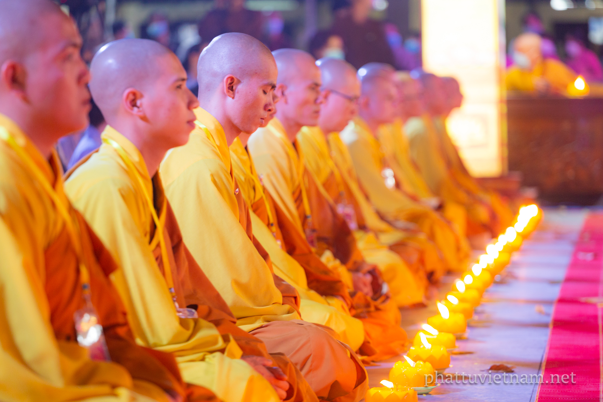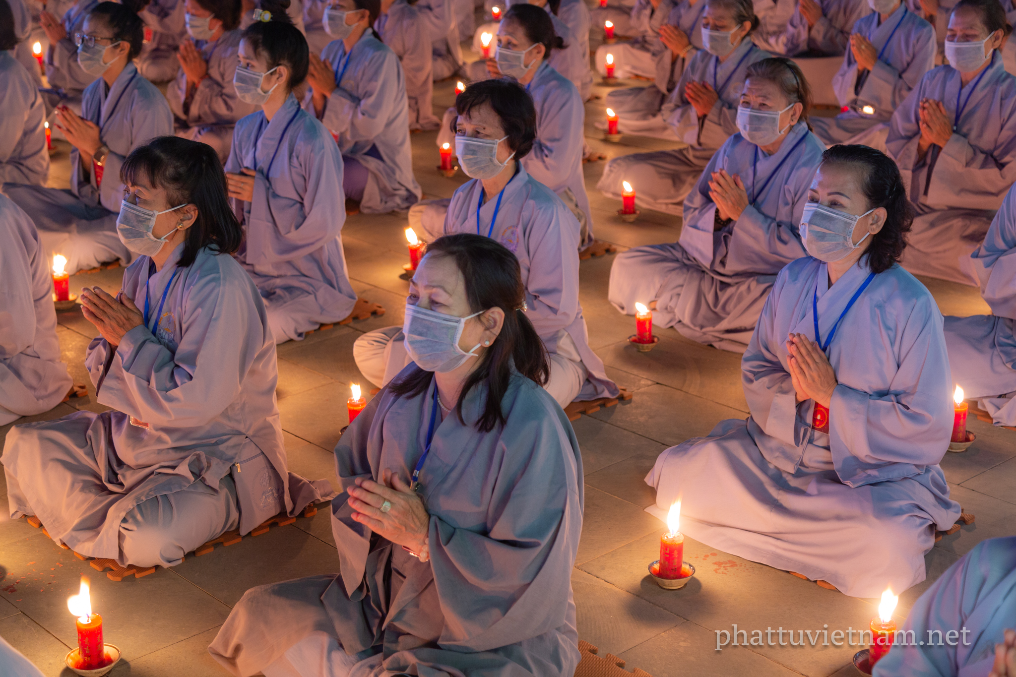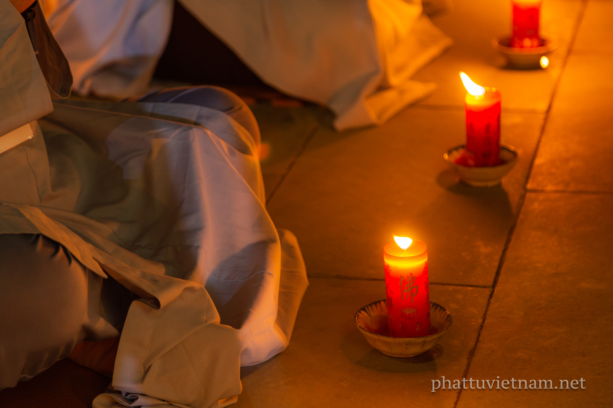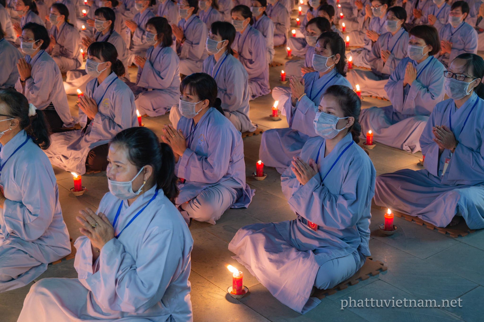 Chư tôn đức Tăng trang nghiêm hồi hướng kết thúc buổi lễ với ánh nến lung linh, trong sự thành kính hướng về Đức Phật A Di Đà.