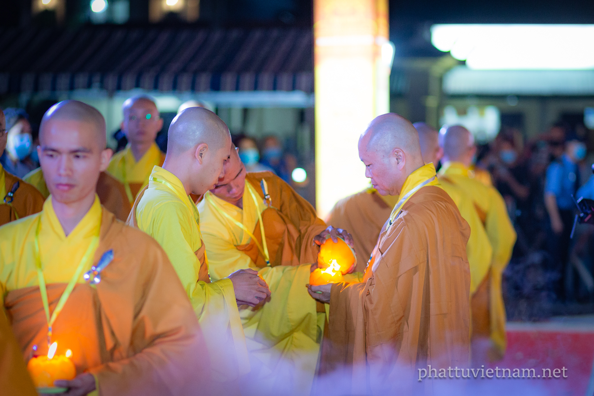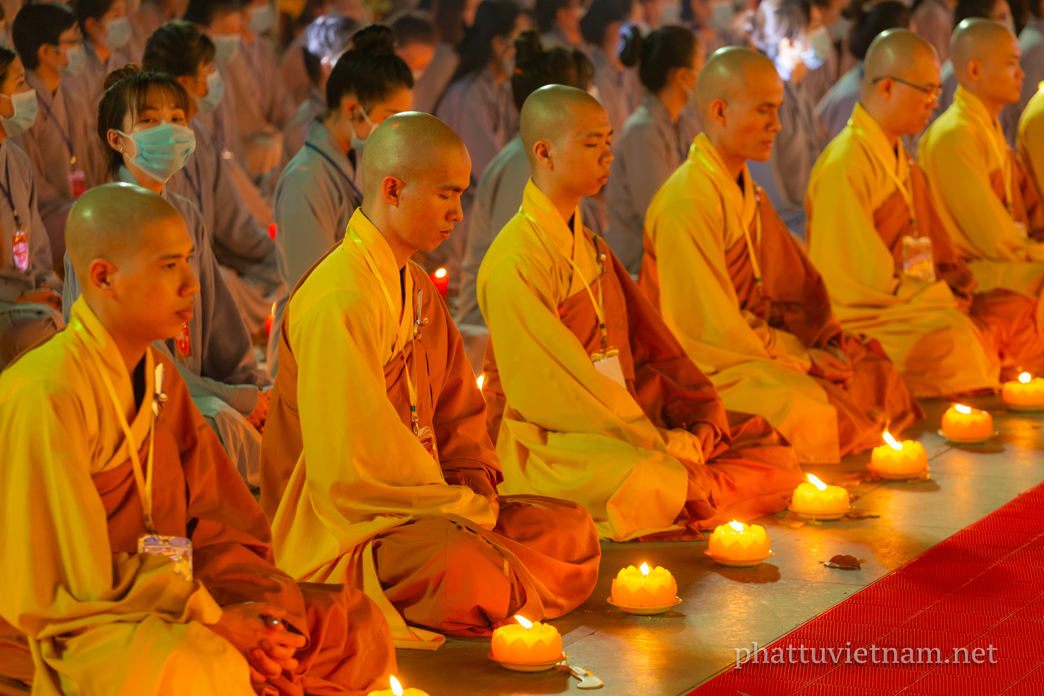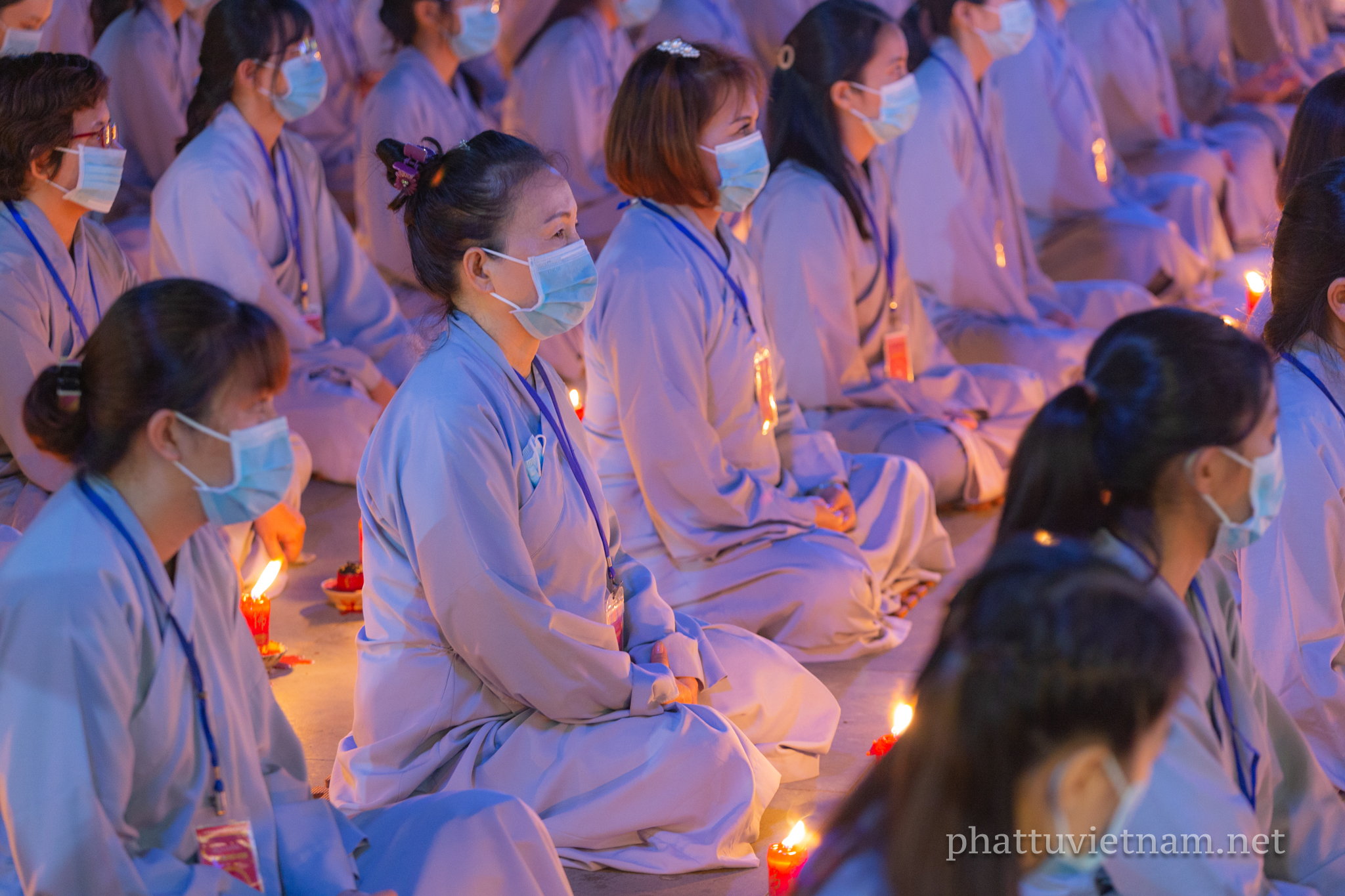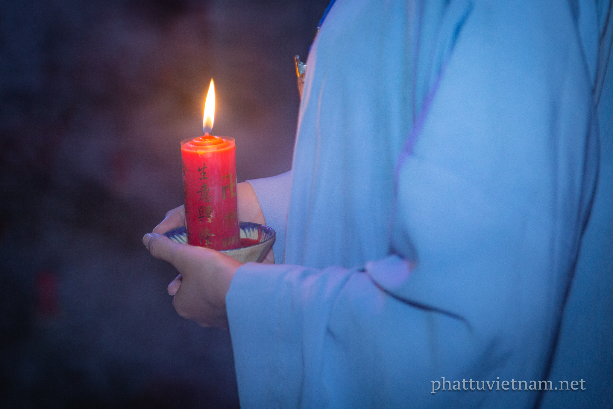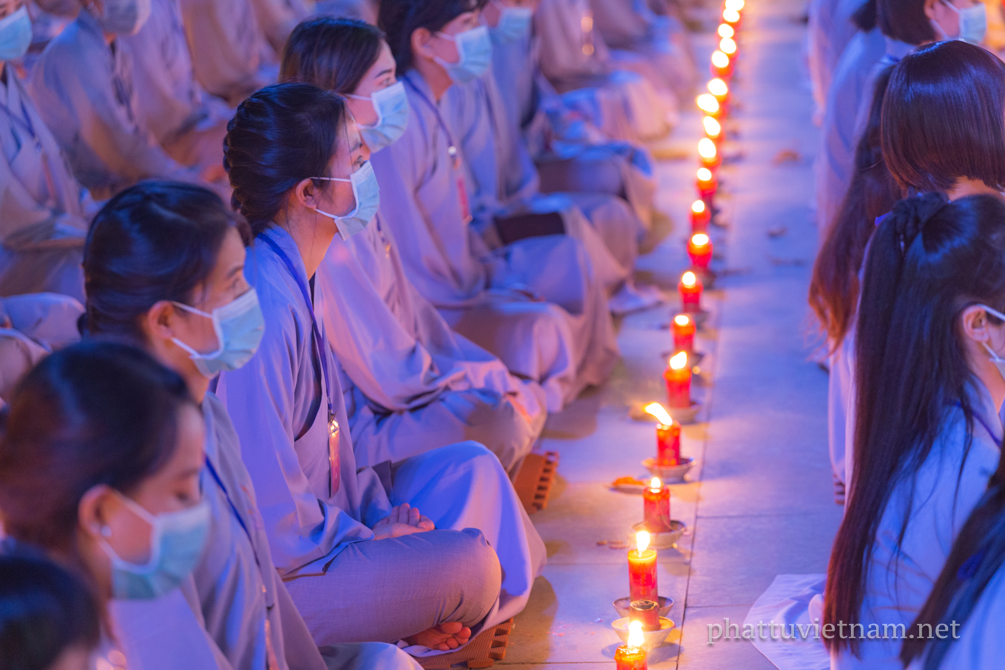 Chư tôn đức Tăng trang nghiêm hồi hướng kết thúc buổi lễ với ánh nến lung linh, trong sự thành kính hướng về Đức Phật A Di Đà.