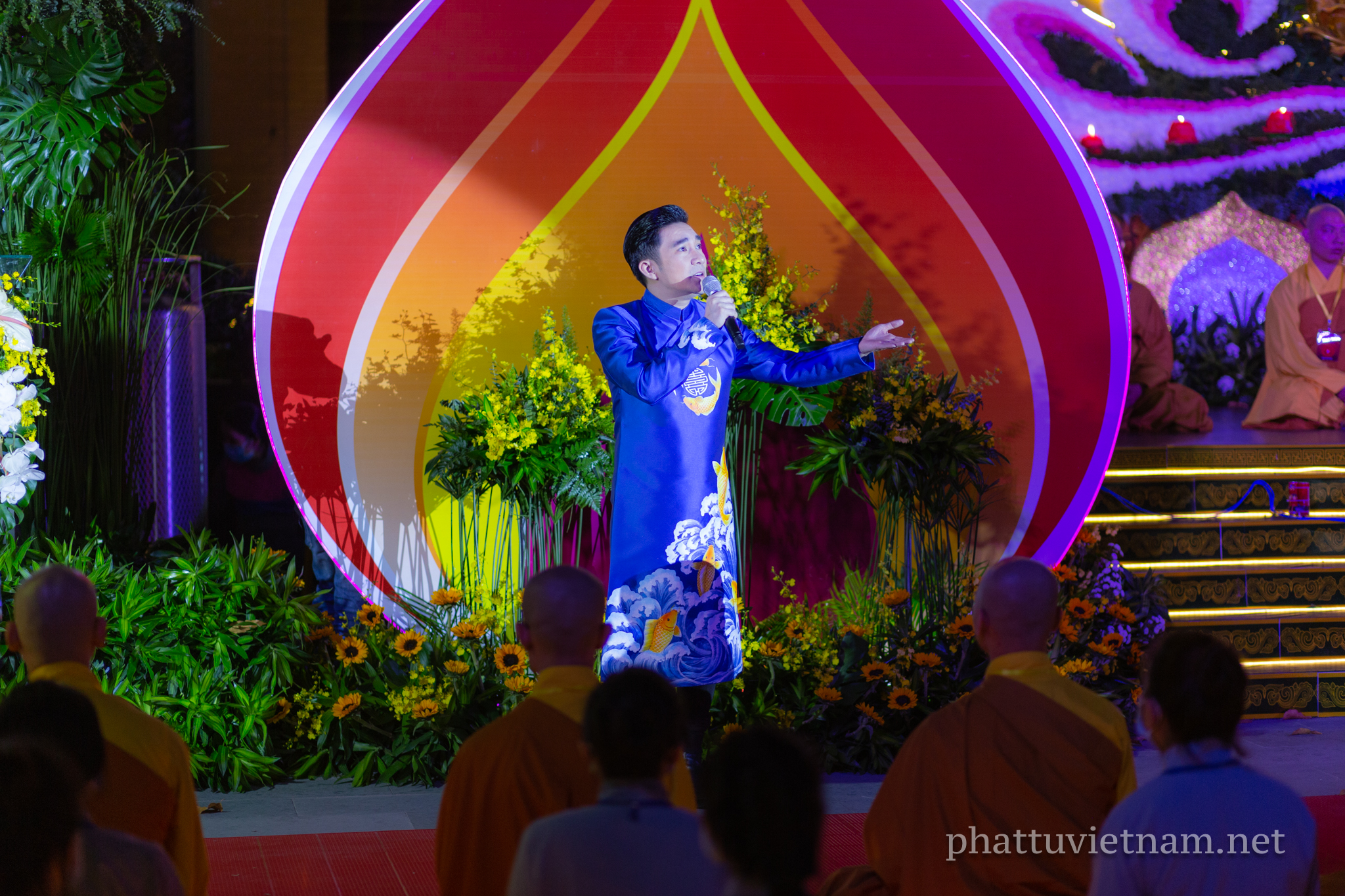 Nữ ca sĩ Kim Linh thể hiện ca khúc Dâng hoa đêm Di Đà cúng dường buổi lễ.
