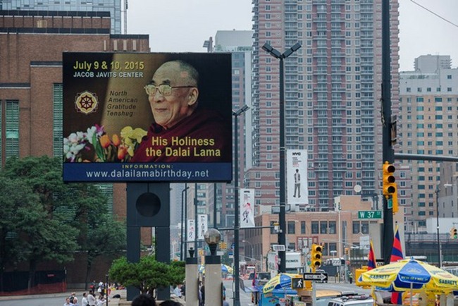 Một bích chương lớn được treo trên các đường phố, thông báo Chương trình đức Đạt Lai Lạt Ma chia sẻ Pháp thoại tại Thành phố New York, Hoa Kỳ. 09/07/2015.