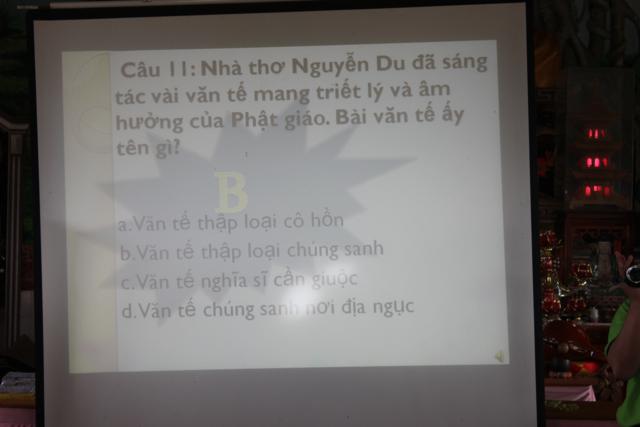 Chiều ngày 29 tháng 12 năm 2012, Mở đầu cho cuộc thi hồi trống pháp là phần xem phim về cuộc đời của Đức Phật Thích Ca Mâu Ni, các bạn tu sinh đã hiểu hơn về cuộc đời của Đức Bổn Sư. Từ đó thấy được sự hy sinh vĩ đại của người đối với nhân loại chúng sinh.