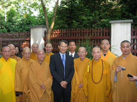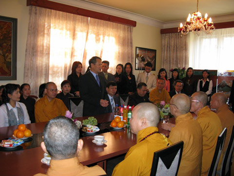 Đại sứ Vương Thừa Phong và chủ tịch Hội người Việt ông Hoàng Đình Thắng cùng bà con Phật tử rất vui mừng cảm động, vì lần đầu tiên chư Tôn đức lãnh đạo TW Giáo hội Phật Giáo Việt Nam đến thăm cộng đồng Việt Nam tại CH Séc.