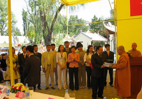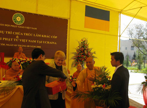 Để biểu lộ lòng tri ân sâu sắc tới Chư tôn đức cùng quý quan khách, TT tân trụ trì đã phát biểu cảm ơn, tặng quà và hoa lưu niệm cho đại diện chính quyền tỉnh Kharkov, Đại sứ quán Việt Nam và lãnh đạo tập đoàn Technocom.