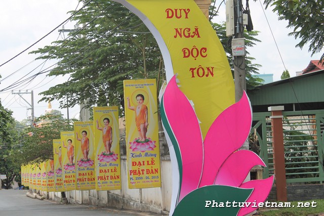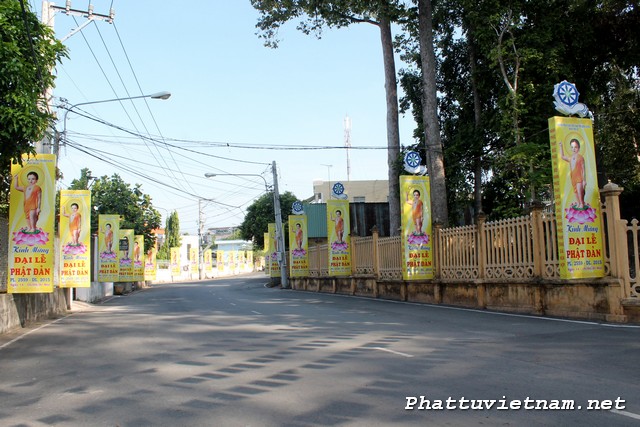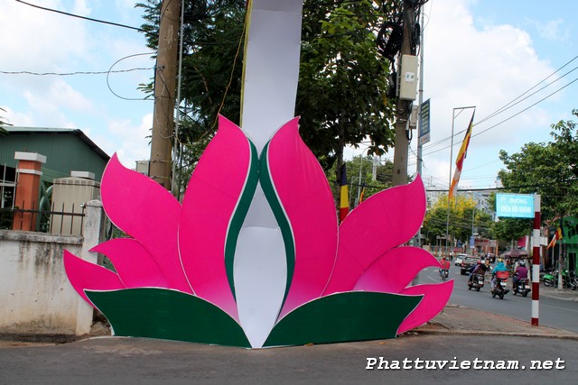 Thăm quan vài vòng đi bộ, chúng tôi thấy logo – hộp đèn – băng rôn – biểu ngữ – liên đăng…v.v được đầu tư rất công phu mang tầm vóc quy mô hoành tráng. Cổng chào từ đầu đường chùa Hội Khánh được thiết kế hài hòa, nhìn sơ qua trông đơn giản – nhưng nếu nhìn thật kĩ thì sự nổi bật của cánh sen lại là điểm nhấn chính cho cổng chào.