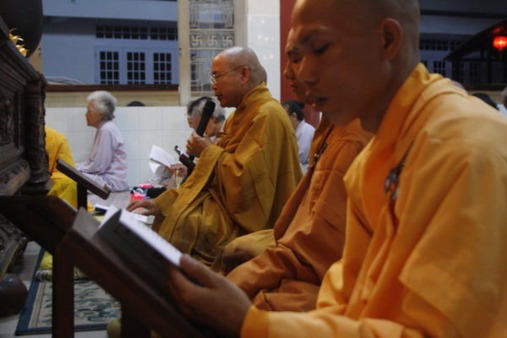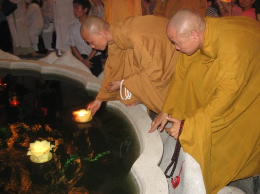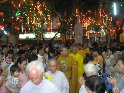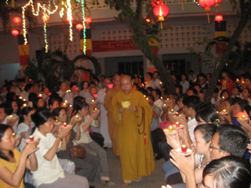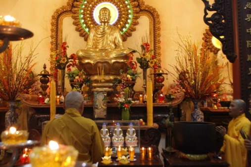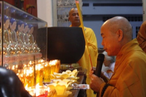 Đúng 19 giờ ba hồi chuông trống Bát Nhã được cử hành vang rền giữa rừng người trang nghiêm thanh tịnh, cung thỉnh chư tôn thiền đức quang lâm chính điện cử hành nghi thức thỉnh Phật và chư thiên quang giáng gia hộ đàn tràng.