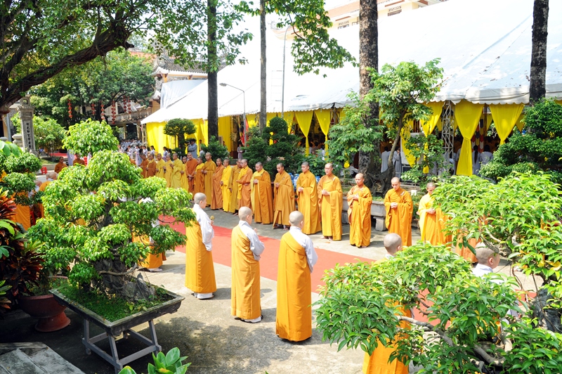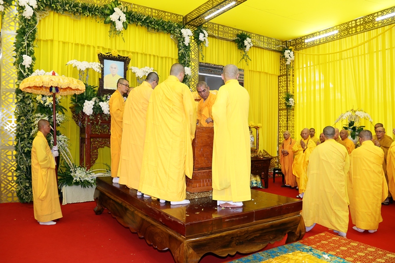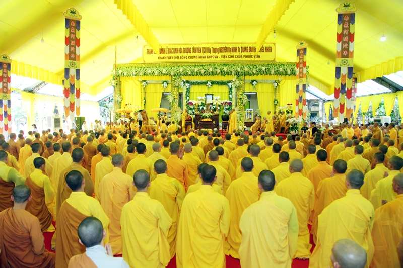 Toàn thể chư tôn đức giáo phẩm, Tăng Ni và Phật tử đã đồng thanh niệm Phật hòa cùng tiếng chuông trống Bát-nhã trầm hùng khi nhục thân của ngài được chư Tăng cung thỉnh nhục thân Hòa thượng rời phương trượng đến nơi tôn trí trước bảo điện chùa Phước Viên.