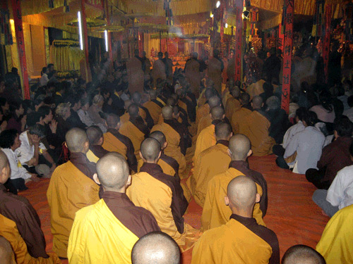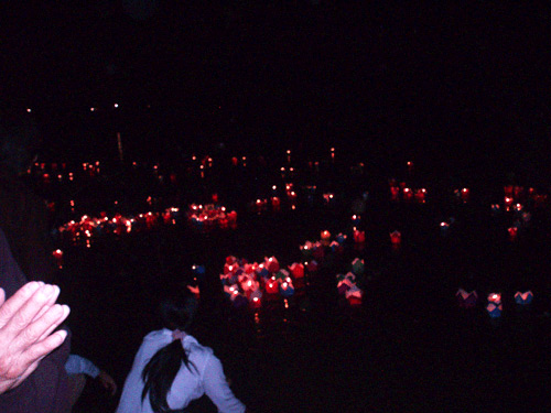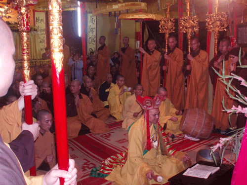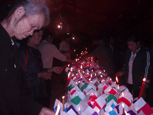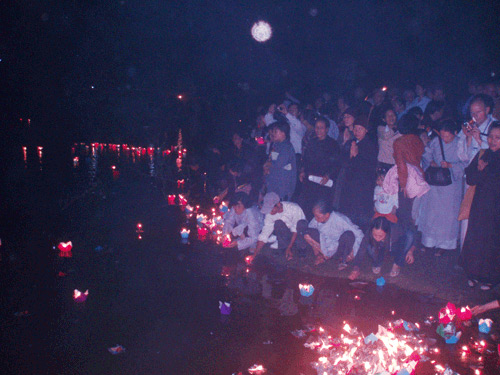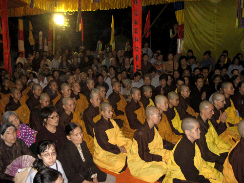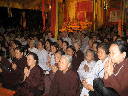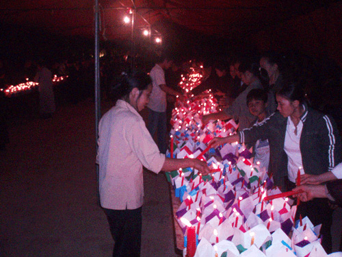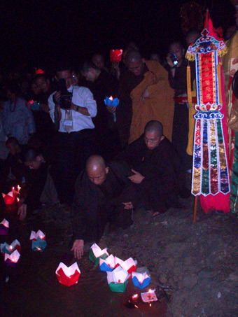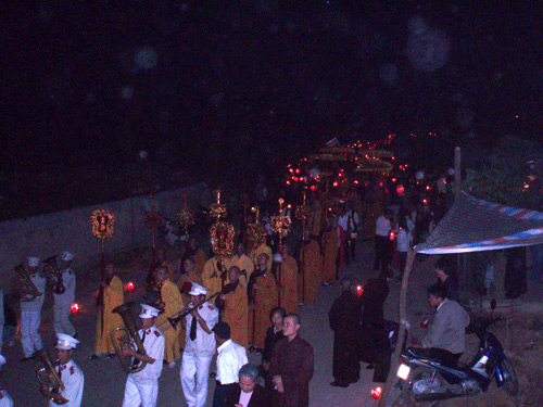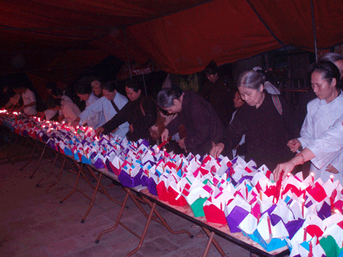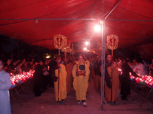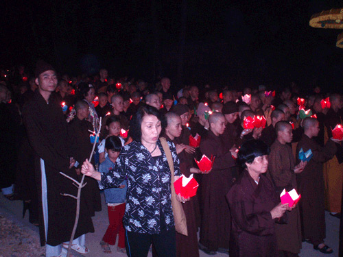 Sau phần nghi thức cúng đăng, phong sinh. Hàng vạn ngọn nến hồng, nến đỏ được lung linh thắp lên. Hòa theo tiếng niệm Bồ Tát Quán Thế Âm, đoàn người chậm rãi từng bước đi thiền hành xuống hồ Thiền Quang trước cổng Học viện. Sư ông Làng Mai thành kính 2 tay bưng lên ngang trán đi đầu phái đoàn khiến đại chúng càng tăng trưởng niềm tin với Tam Bảo.