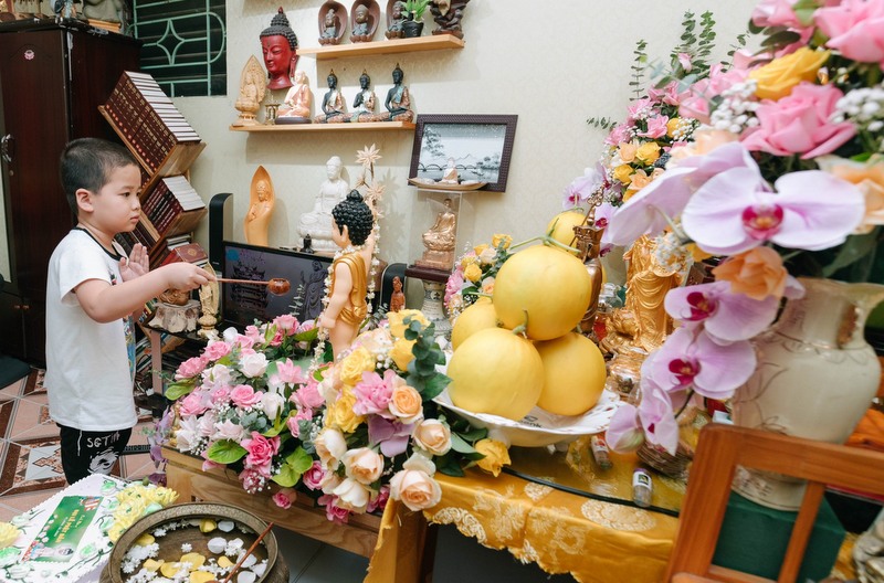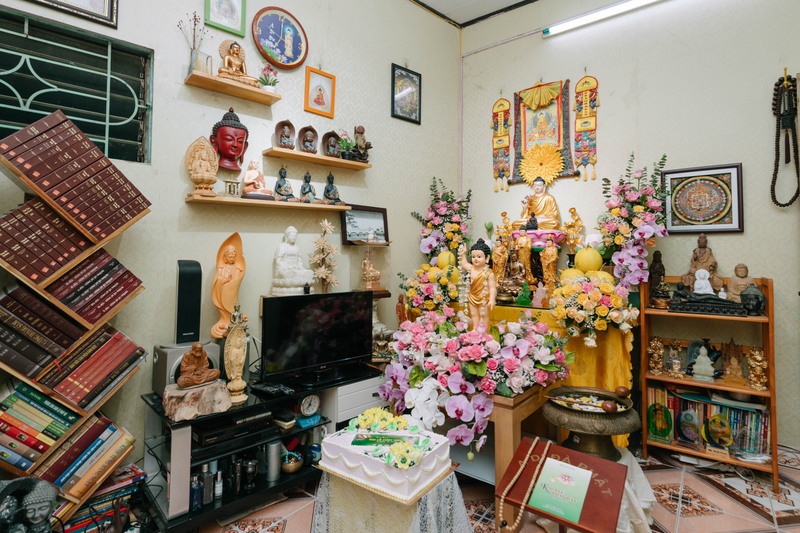 Anh cho biết, hàng năm anh và bạn bè đều thiết kế lễ đài tại nhà như vậy trước không gian của bàn Phật chính, tạo một không gian thật ấm cúng và gần gũi khi hành lễ.