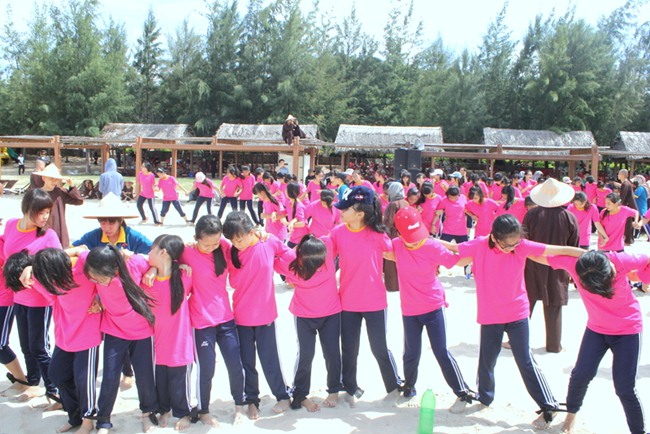 Đến 5h30”, hơn 20 chiếc xe đã đưa các em và các Ban phục vụ cho chuyến đi tập trung tại sân đổ xe trong khuôn viên bãi biển Hồ Cốc. Tiếp theo, các Chánh điểm danh và theo hiệu lệnh của các thầy trong BTC, các em đi vào khu vực sinh hoạt của mình xếp gọn hành lý và tập trung ra bãi biển sắp xếp đội hình đội ngũ. Nếu Chánh nào chậm trễ không ổn định hàng ngũ đúng thời gian quy định thì cả Chánh bị phạt hít đất.