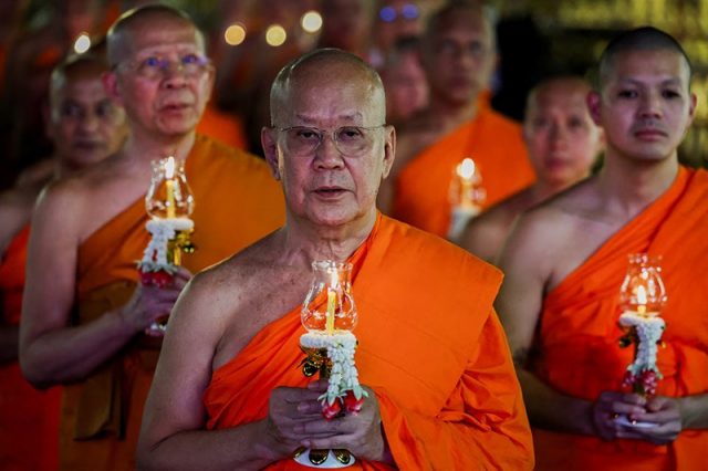 Các nhà sư Phật giáo cầm nến cầu nguyện trong buổi lễ kỷ niệm Ngày Vesak tại chùa Wat Saket, ở Bangkok, Thái Lan, ngày 11/5.