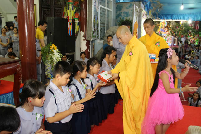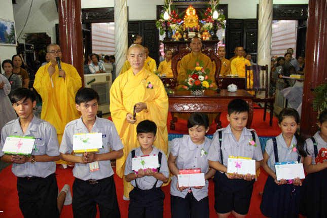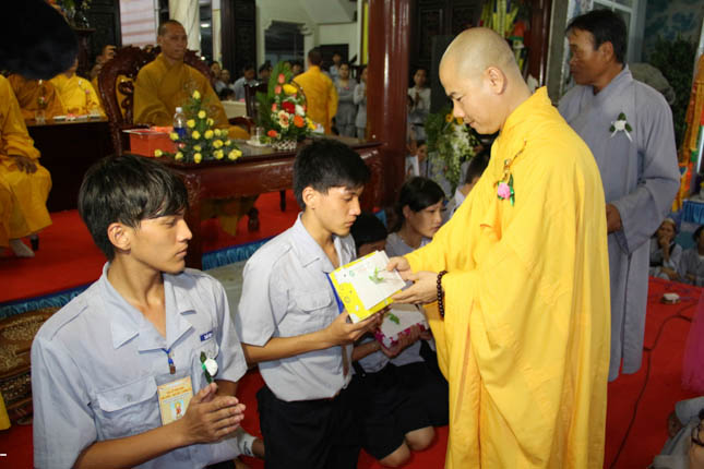 Cũng tại buổi lễ cài hoa hồng mùa hiếu hạnh, ĐĐ. Thích Thông Đạo đã chia sẻ cùng các đoàn sinh GĐPT bất hạnh phải mồ côi Cha Mẹ. Với tất cả tấm lòng, Đại đức đã tự tay cài lên ngực áo các em đóa hoa hồng nơ trắng, và cả những đóa hoa trắng bất hạnh. 10 phần quà bao gồm vải lam để các em may đồng phục đến chùa và 1 triệu đồng cũng đã được Đại đức trao đến các em trong mùa Vu Lan báo hiếu.