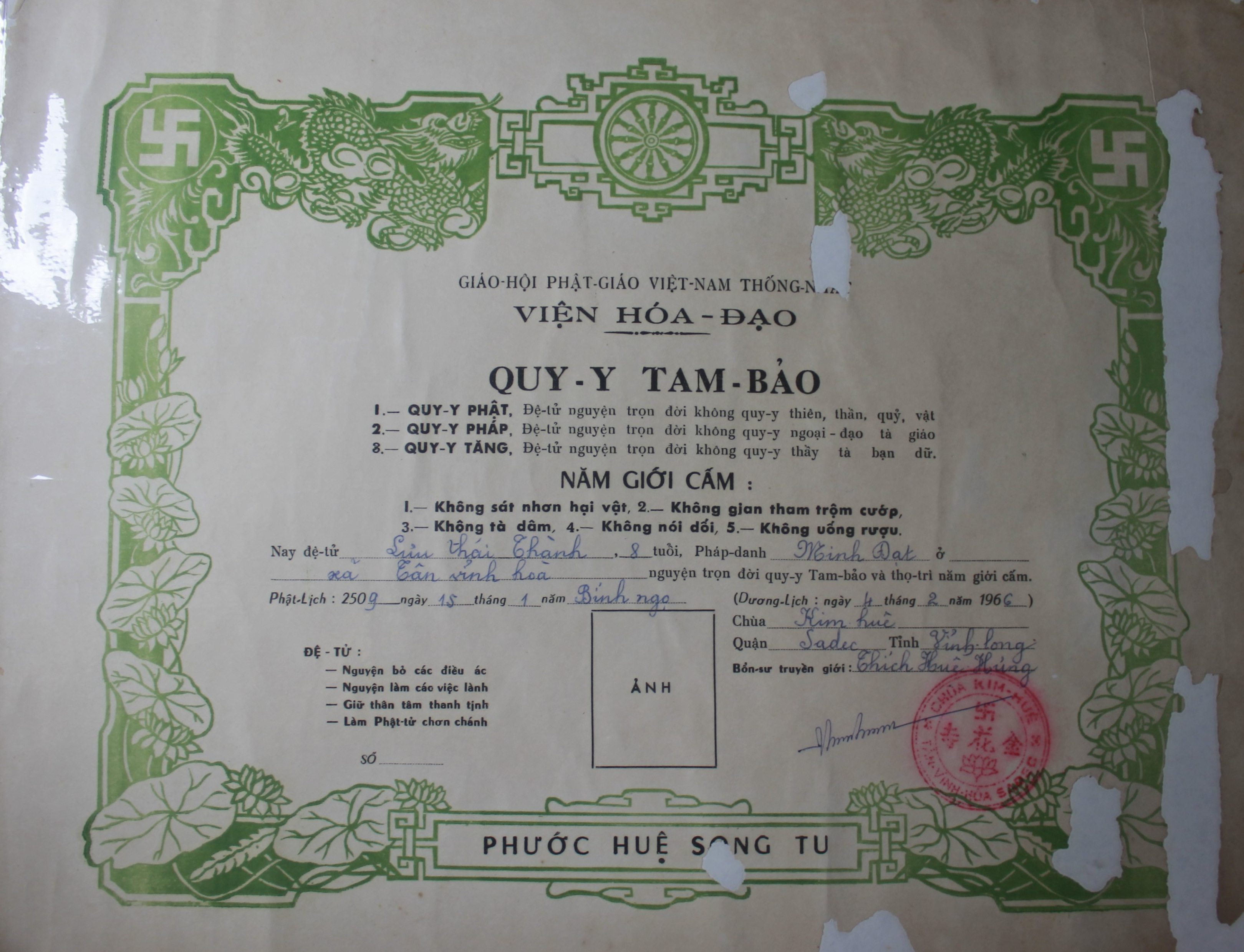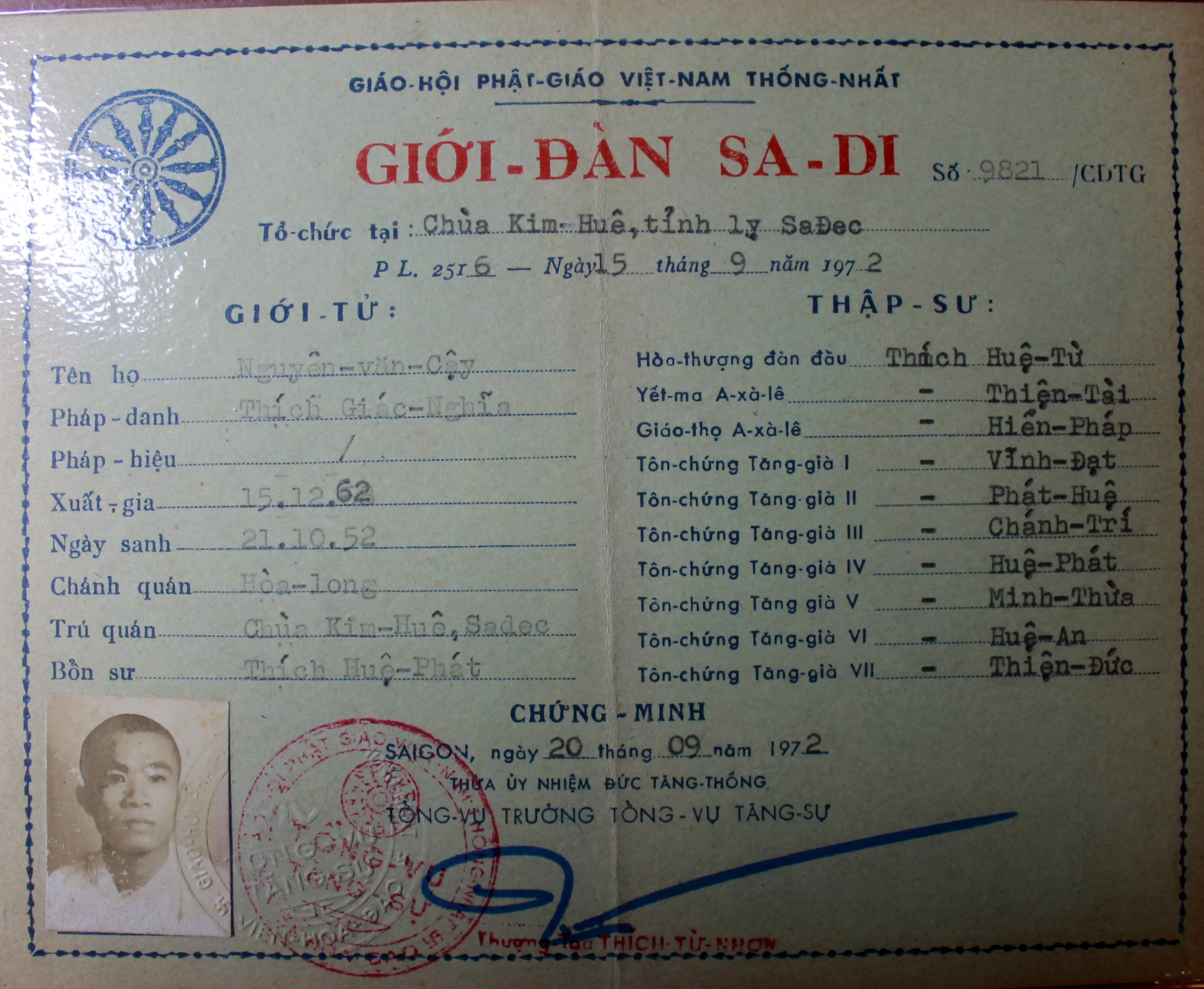 Ngài chính thức thọ Sa di năm 1942; thọ Tỳ kheo Bồ tát giới tại chùa Viên Giác ở Vĩnh Long năm 1943.